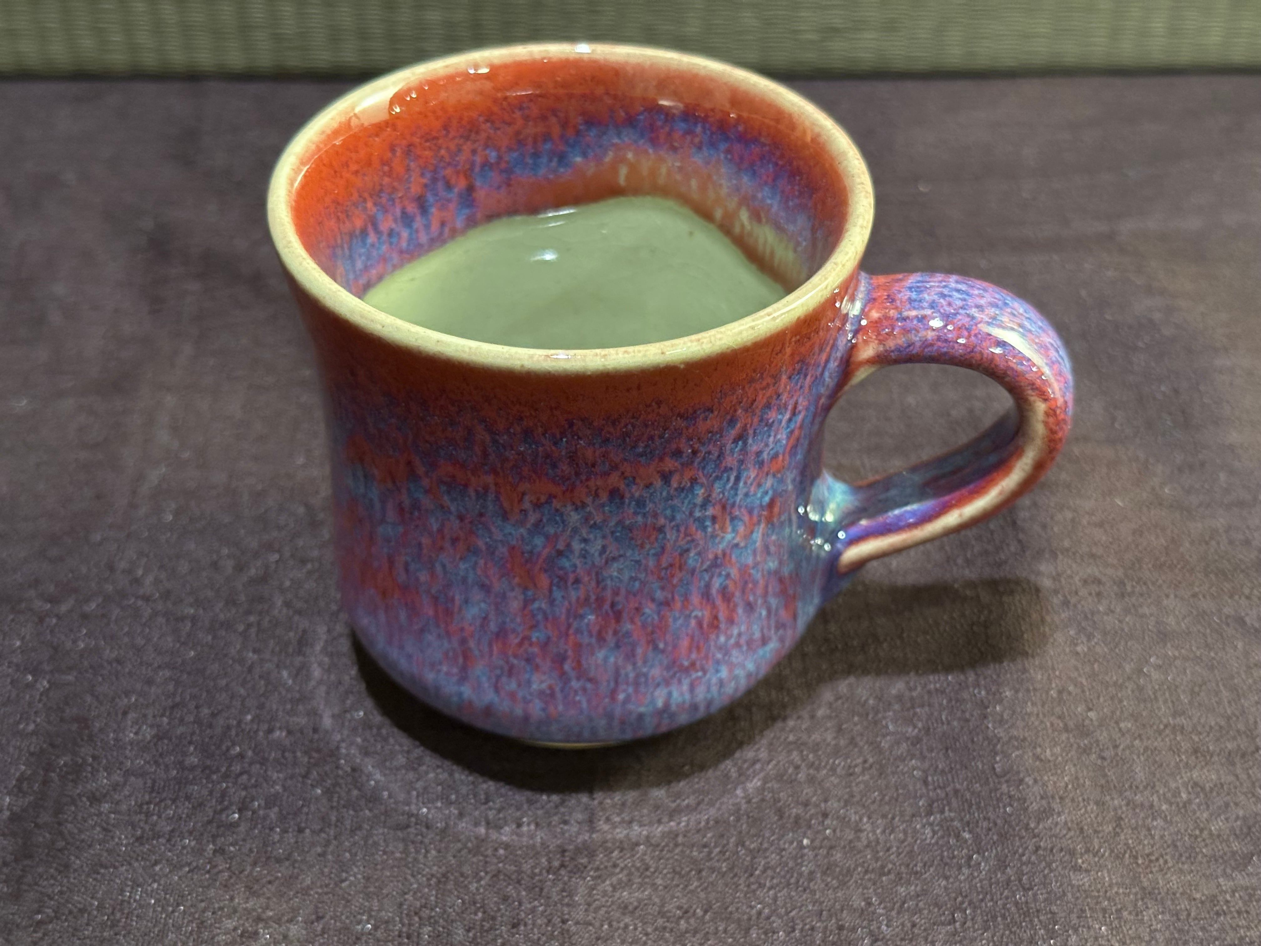 赤(辰砂)にくわえ紫系統の色釉薬を重ね、掛け溶け合う二つの色は何度見ても見飽きず、こぶ志焼ならではの美しいコントラストとなっています。