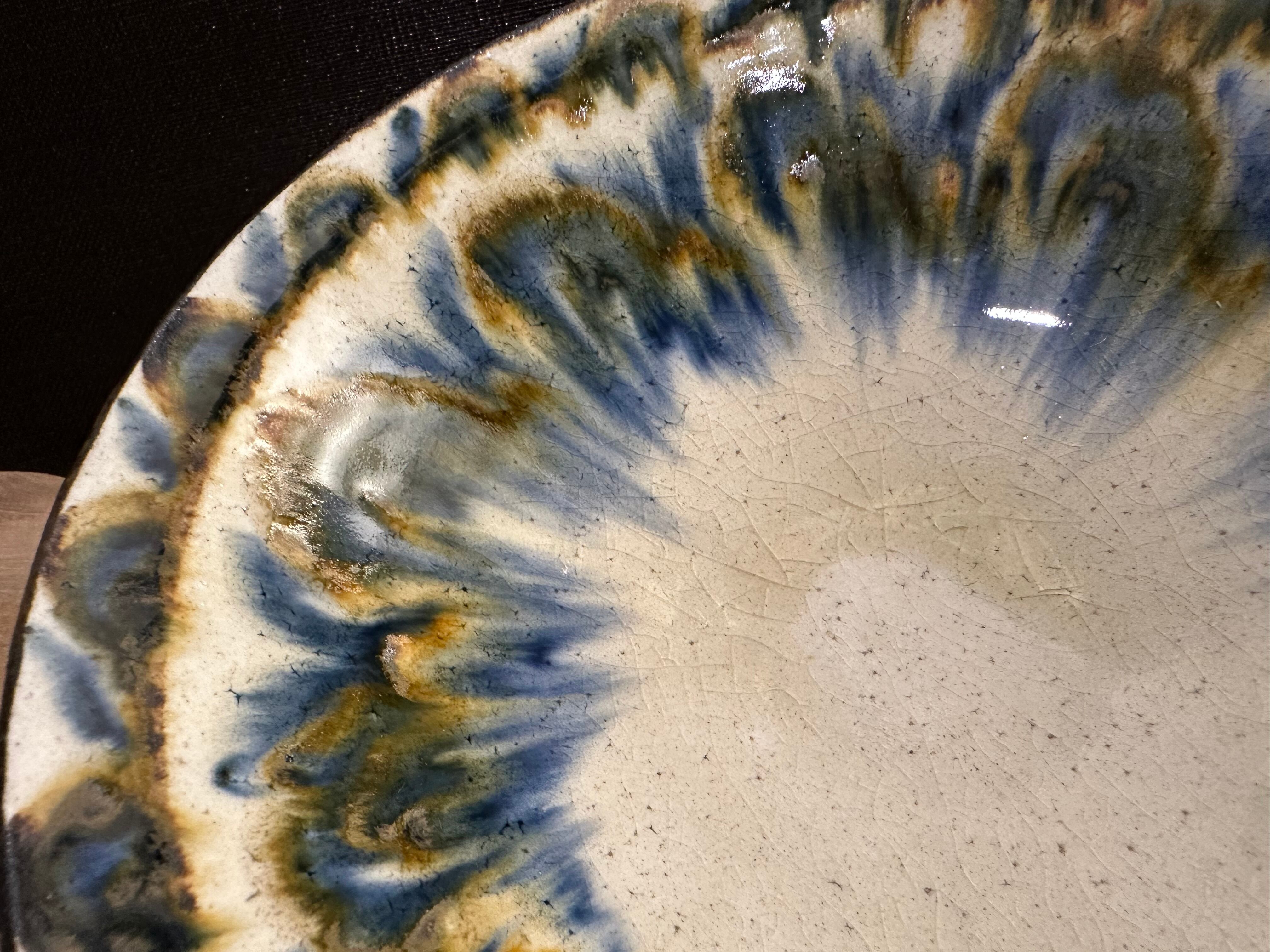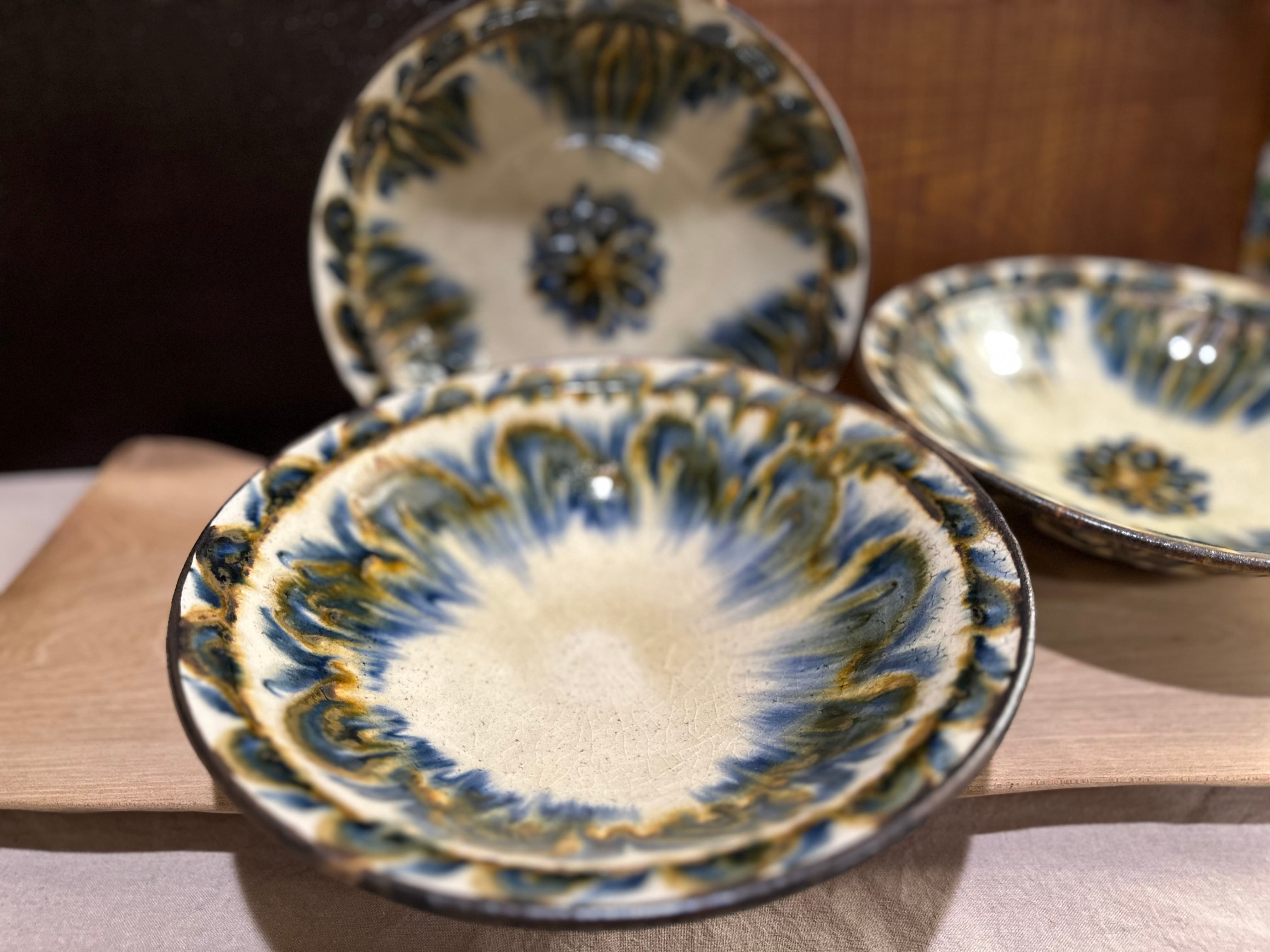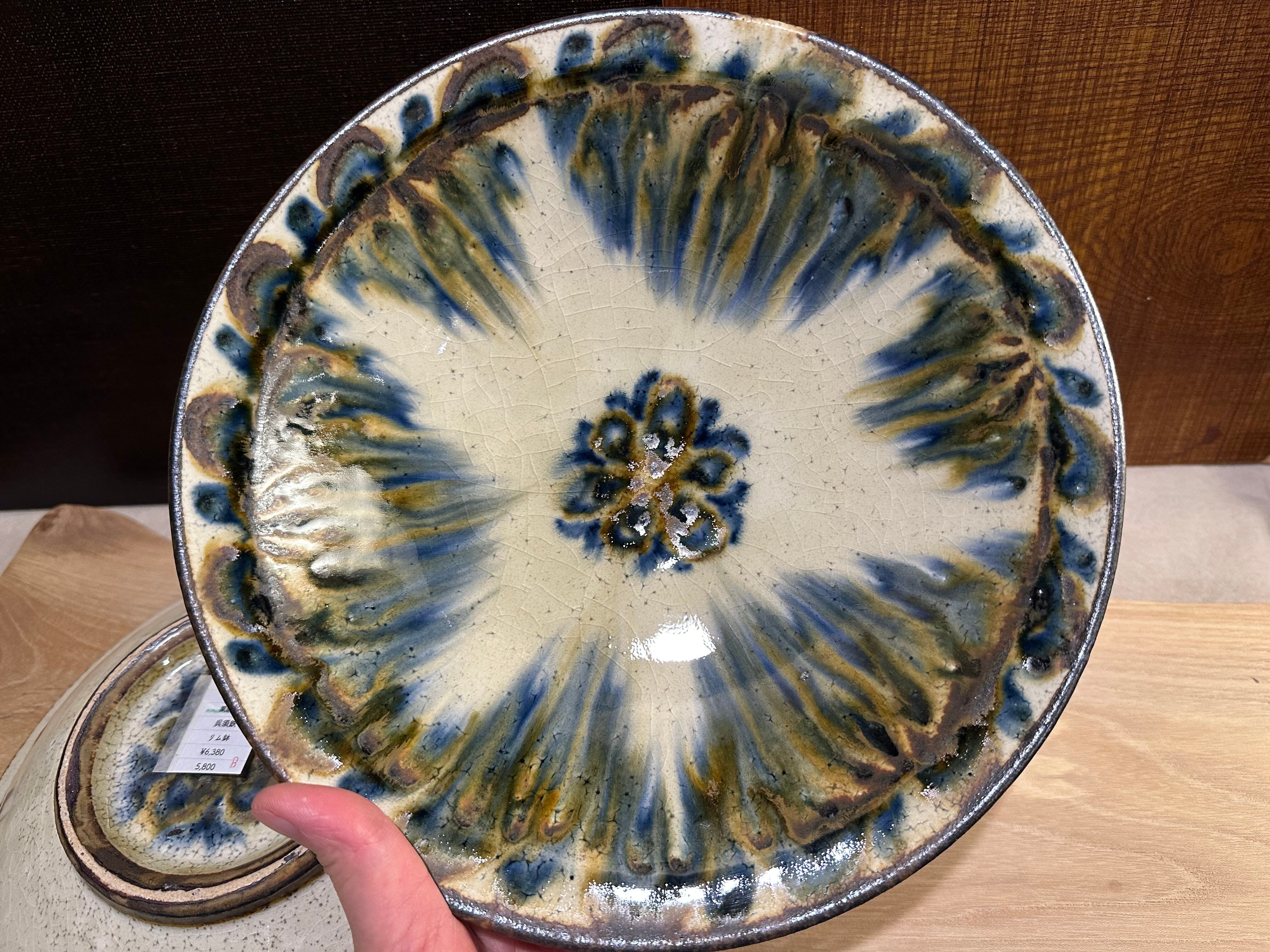 仕上げに灰釉を掛ける事で青色・茶色の模様が滲んだ様子がお気に入りとの事で、試作的に異なる焼き方の作品も混ざっております。