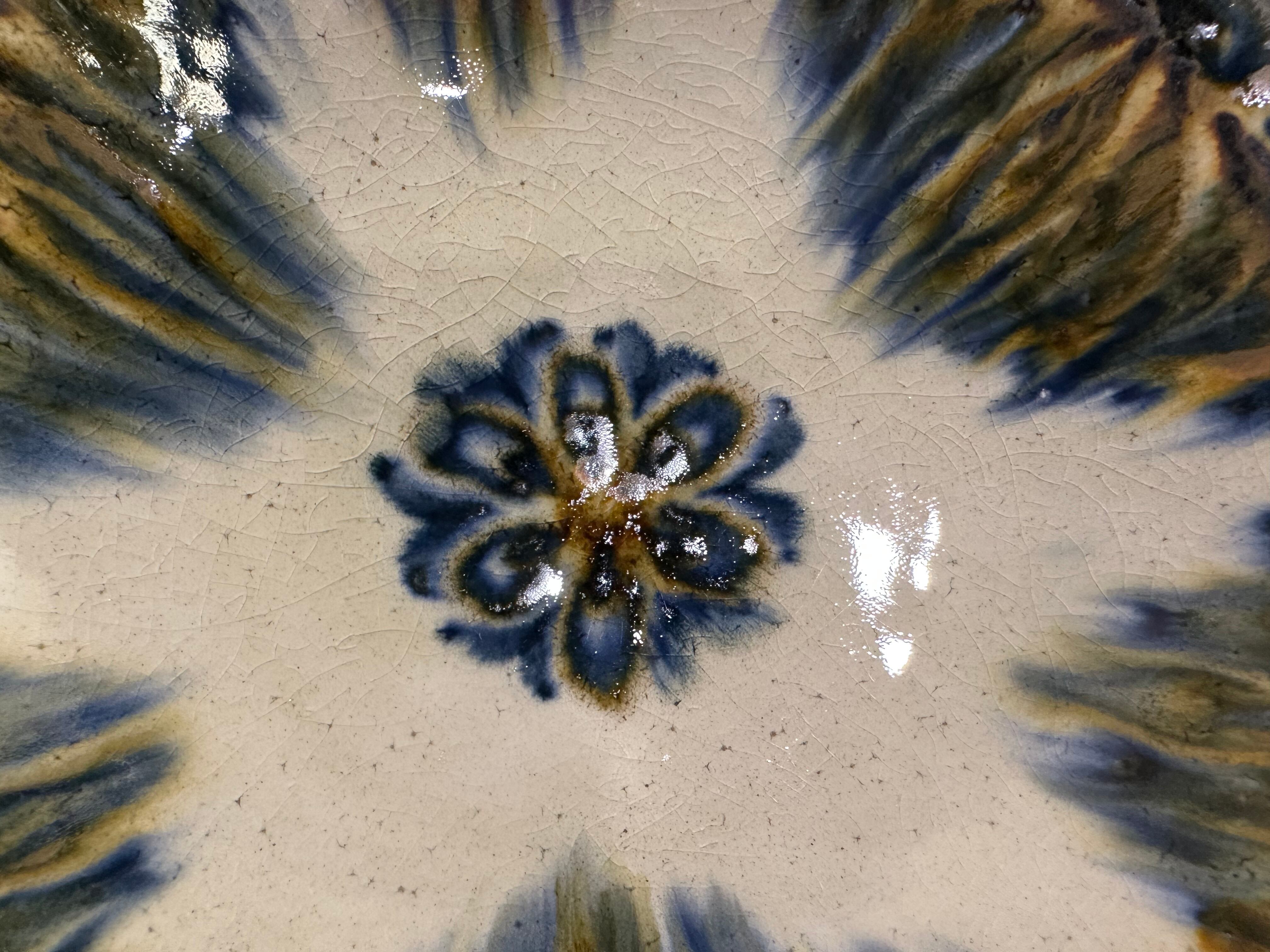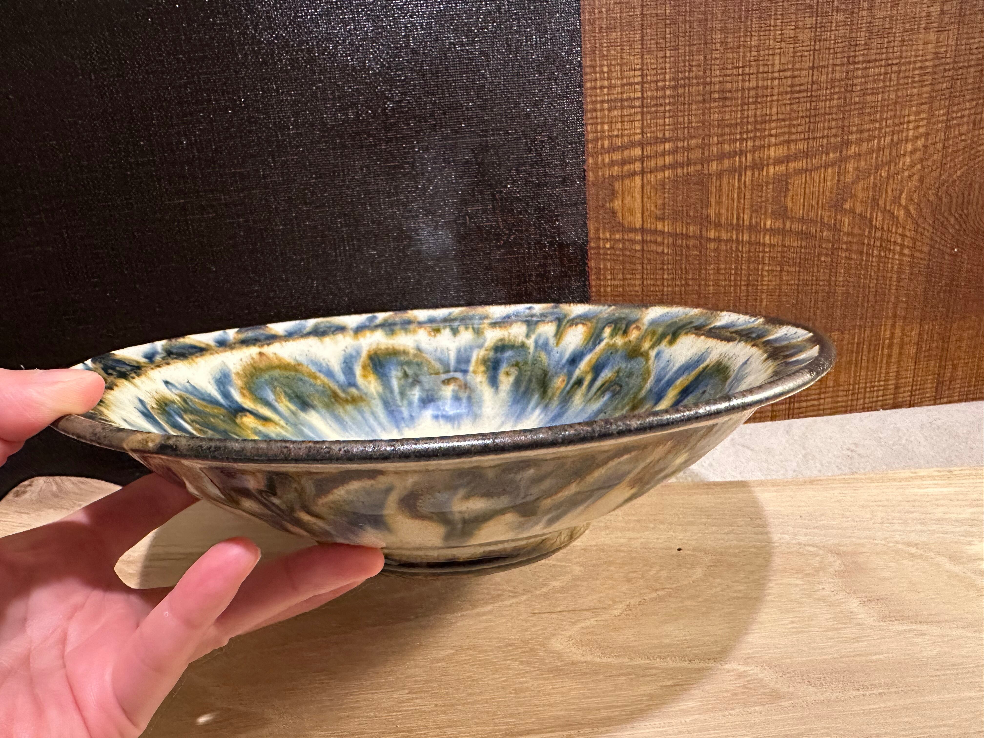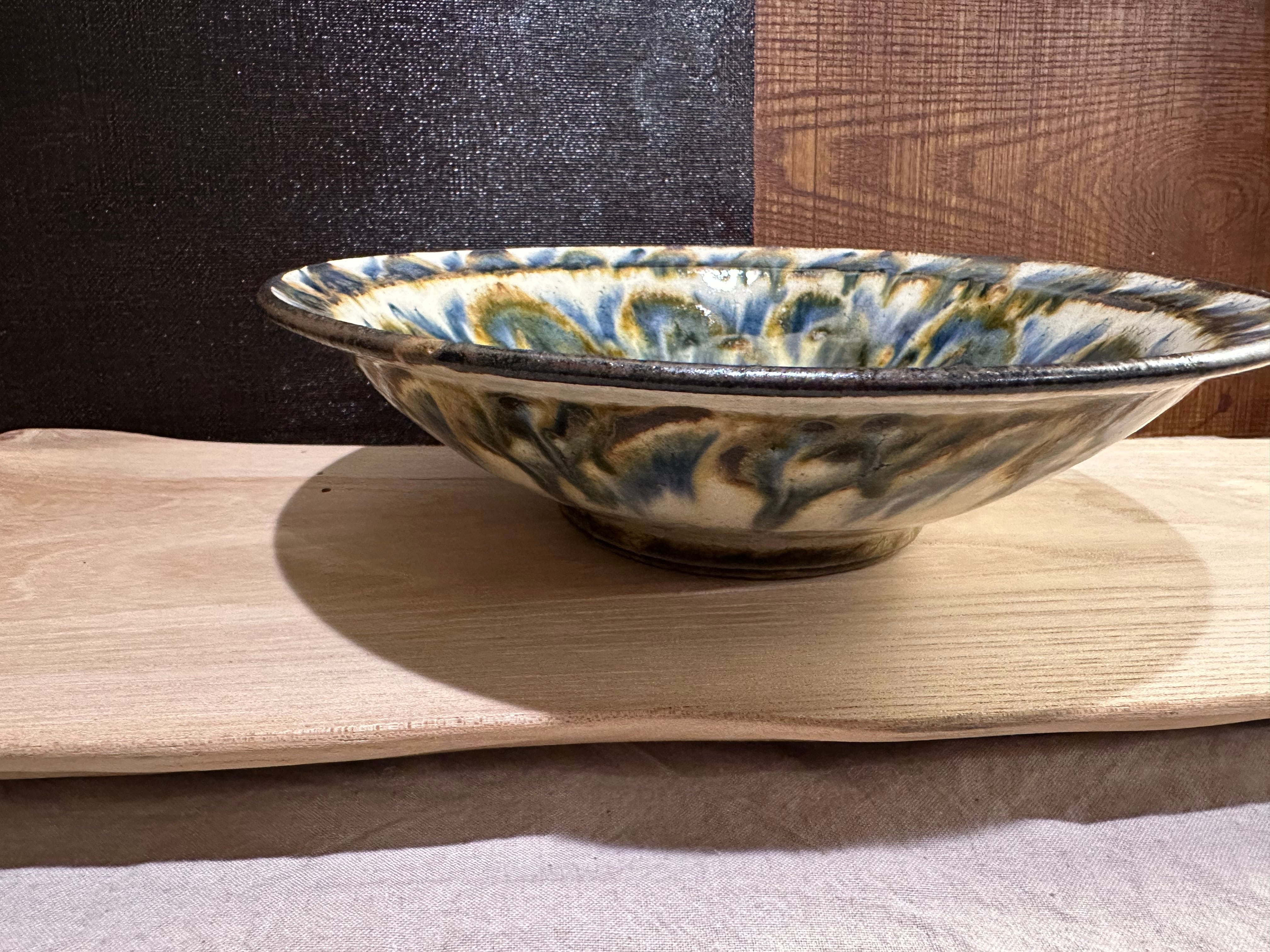 仕上げに灰釉を掛ける事で青色・茶色の模様が滲んだ様子がお気に入りとの事で、試作的に異なる焼き方の作品も混ざっております。