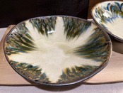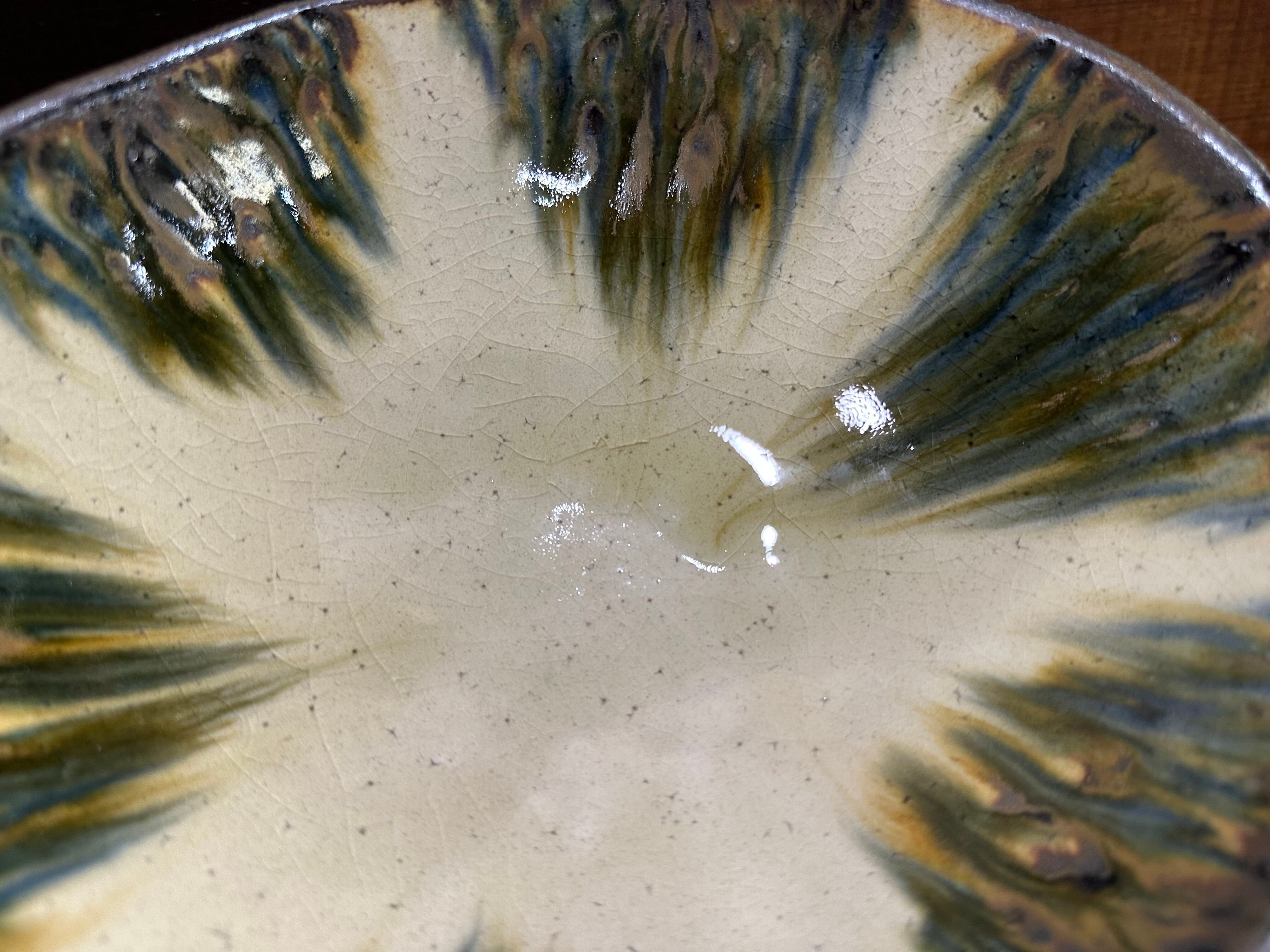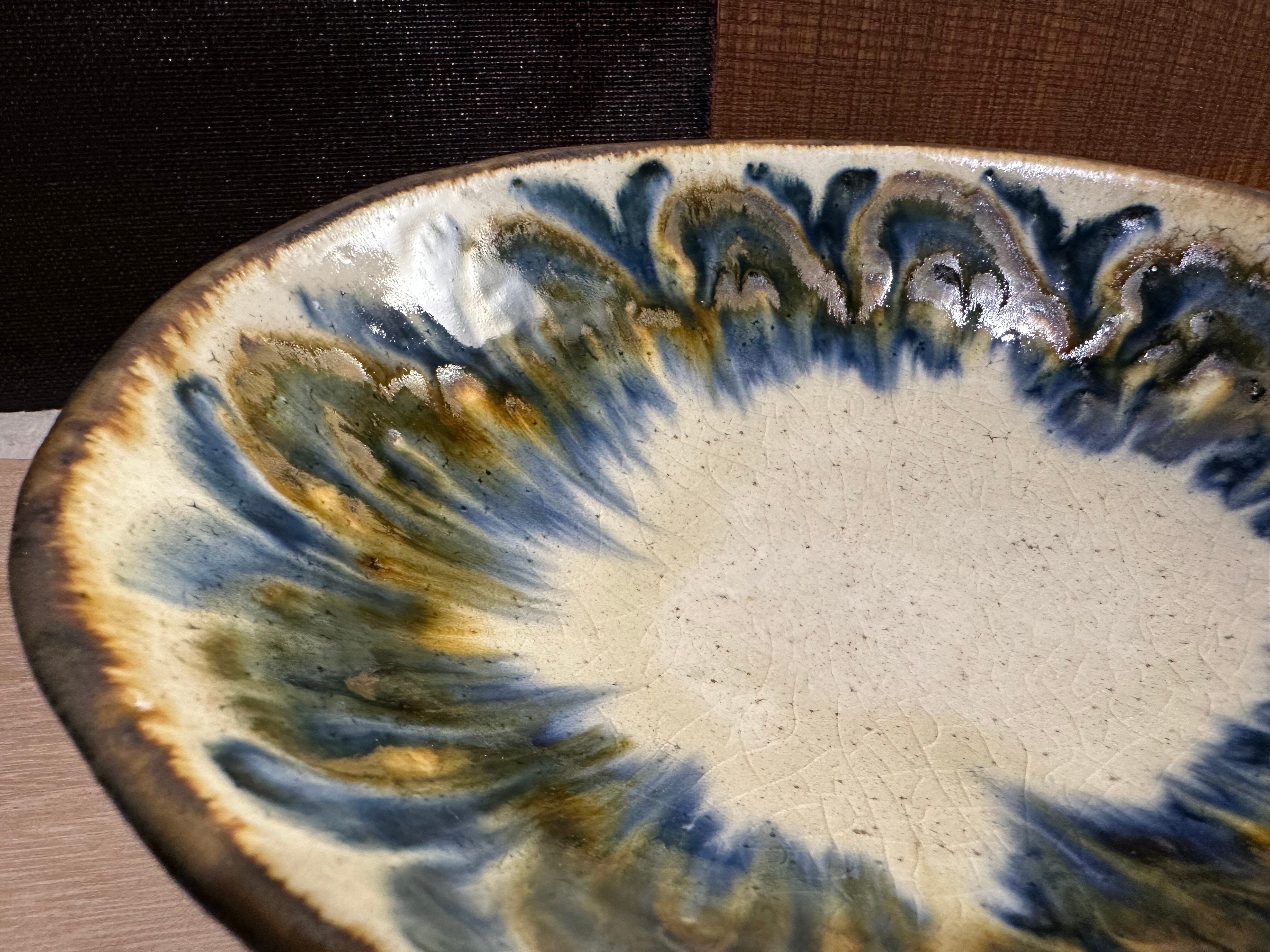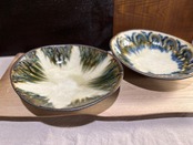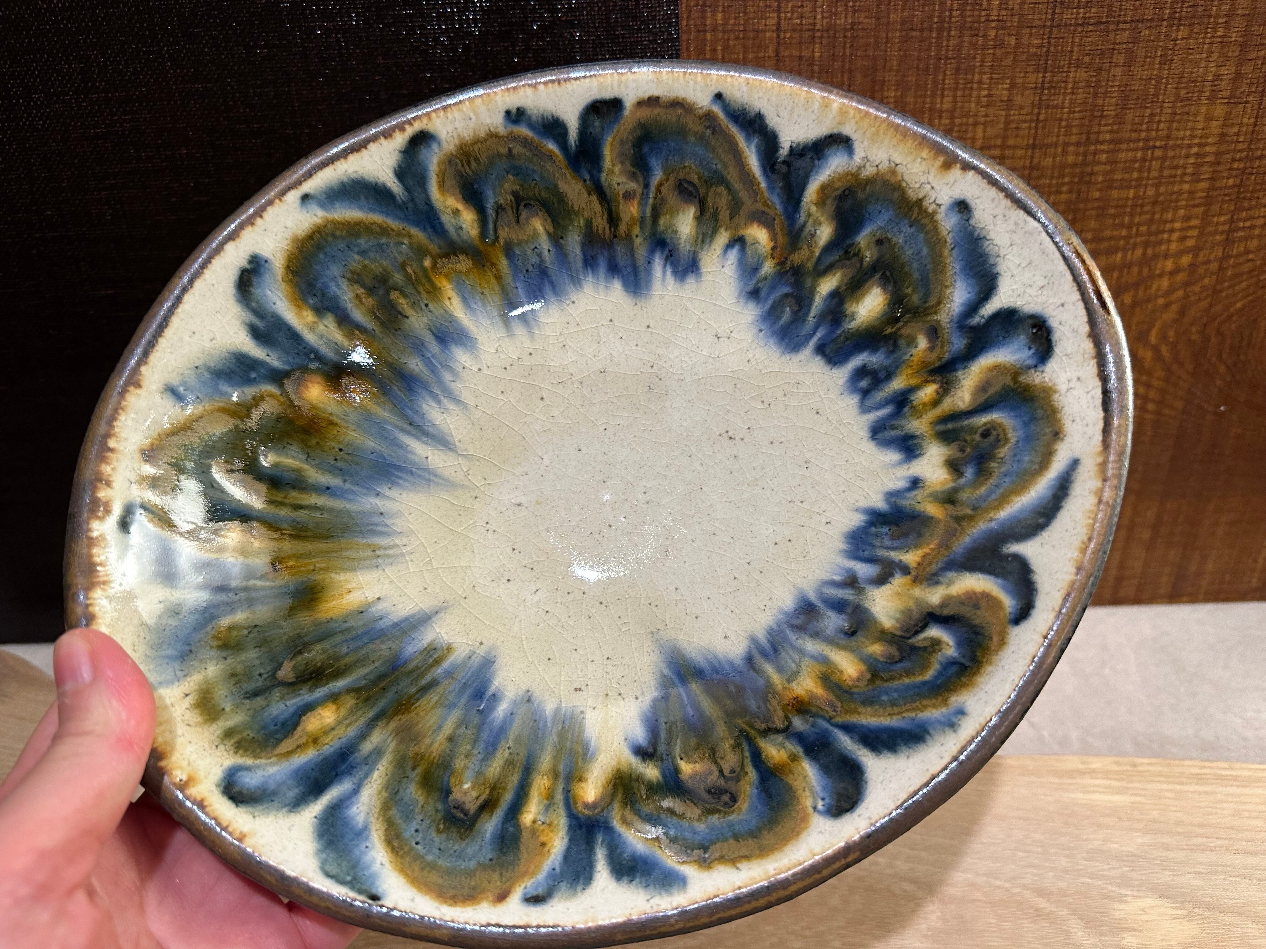 仕上げに灰釉を掛ける事で青色・茶色の模様が滲んだ様子がお気に入りとの事で、試作的に異なる焼き方の作品も混ざっております。