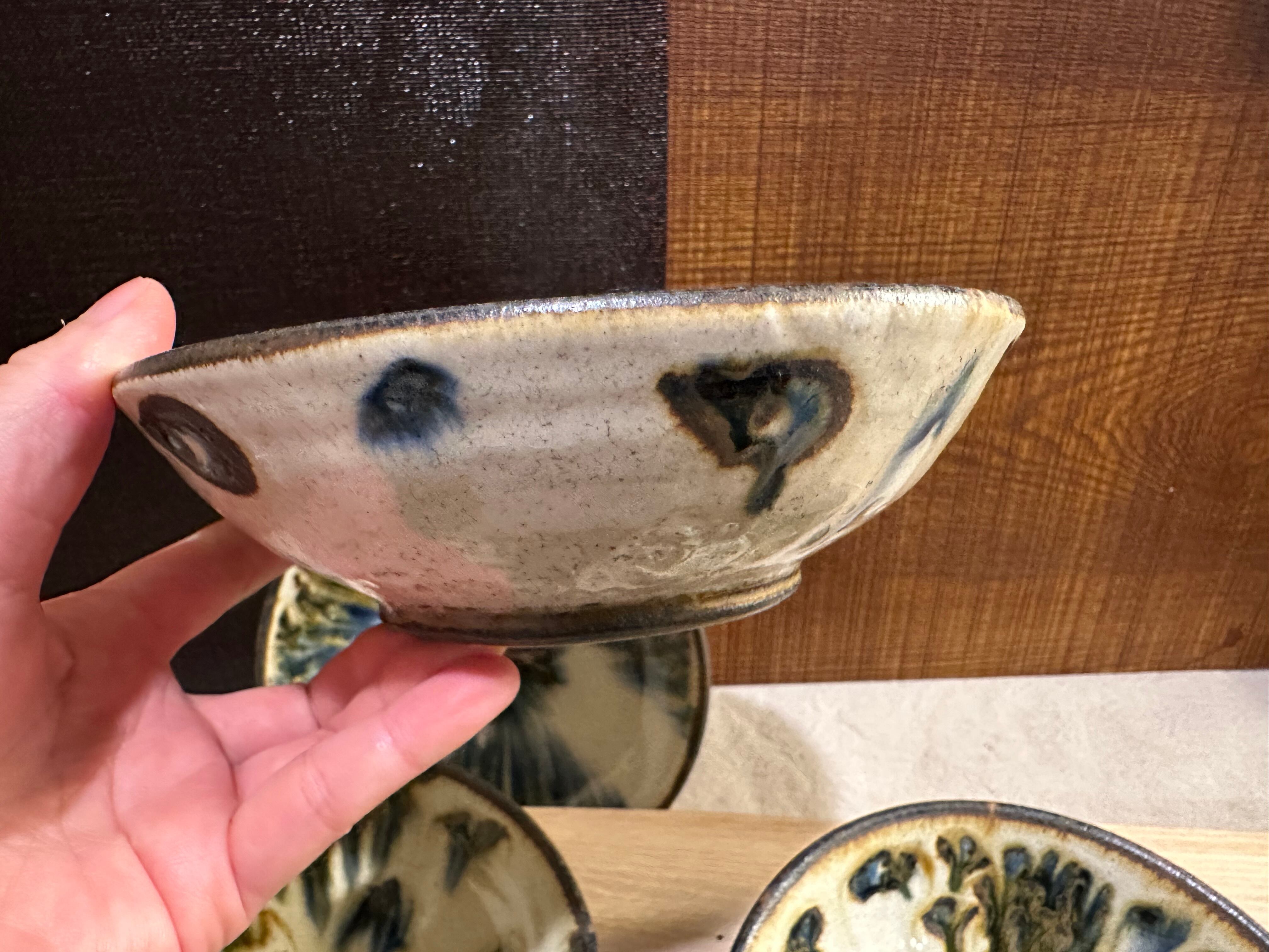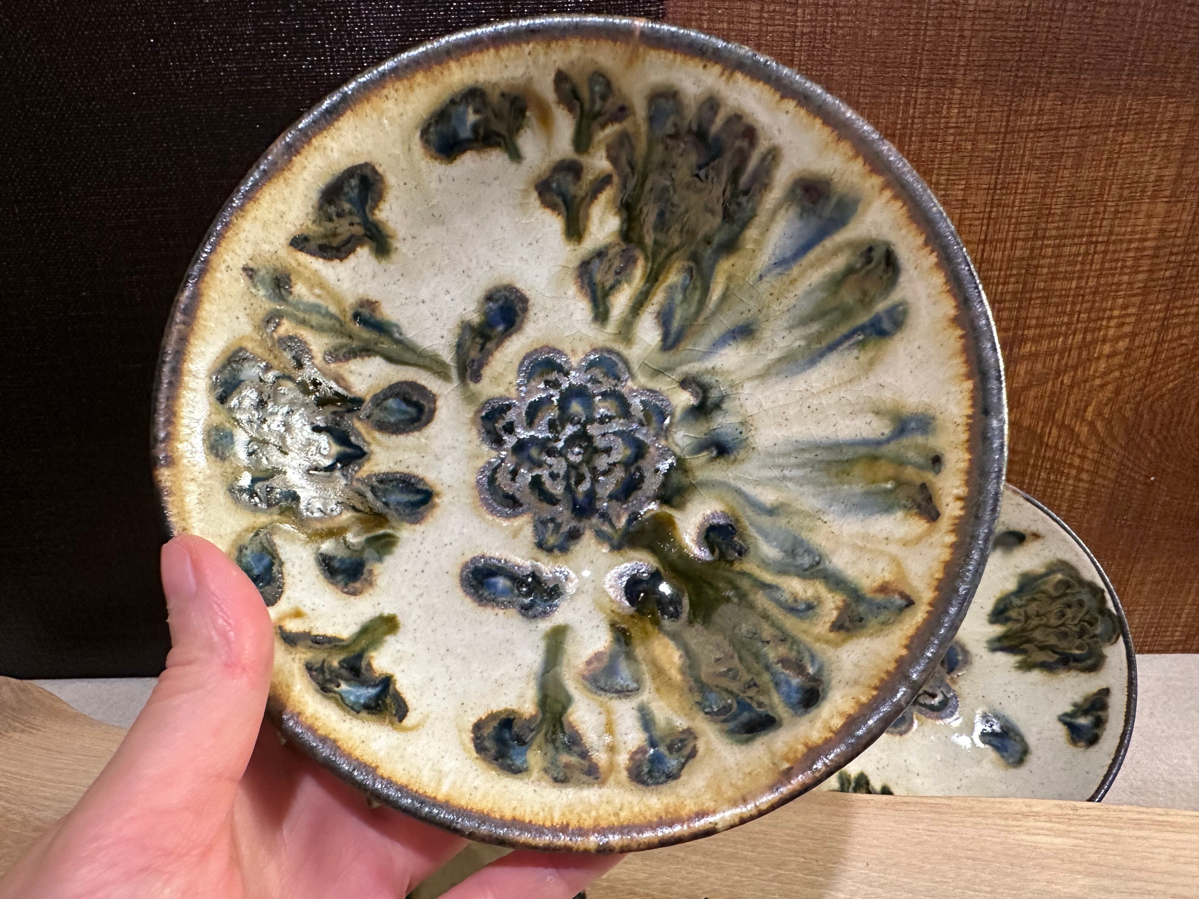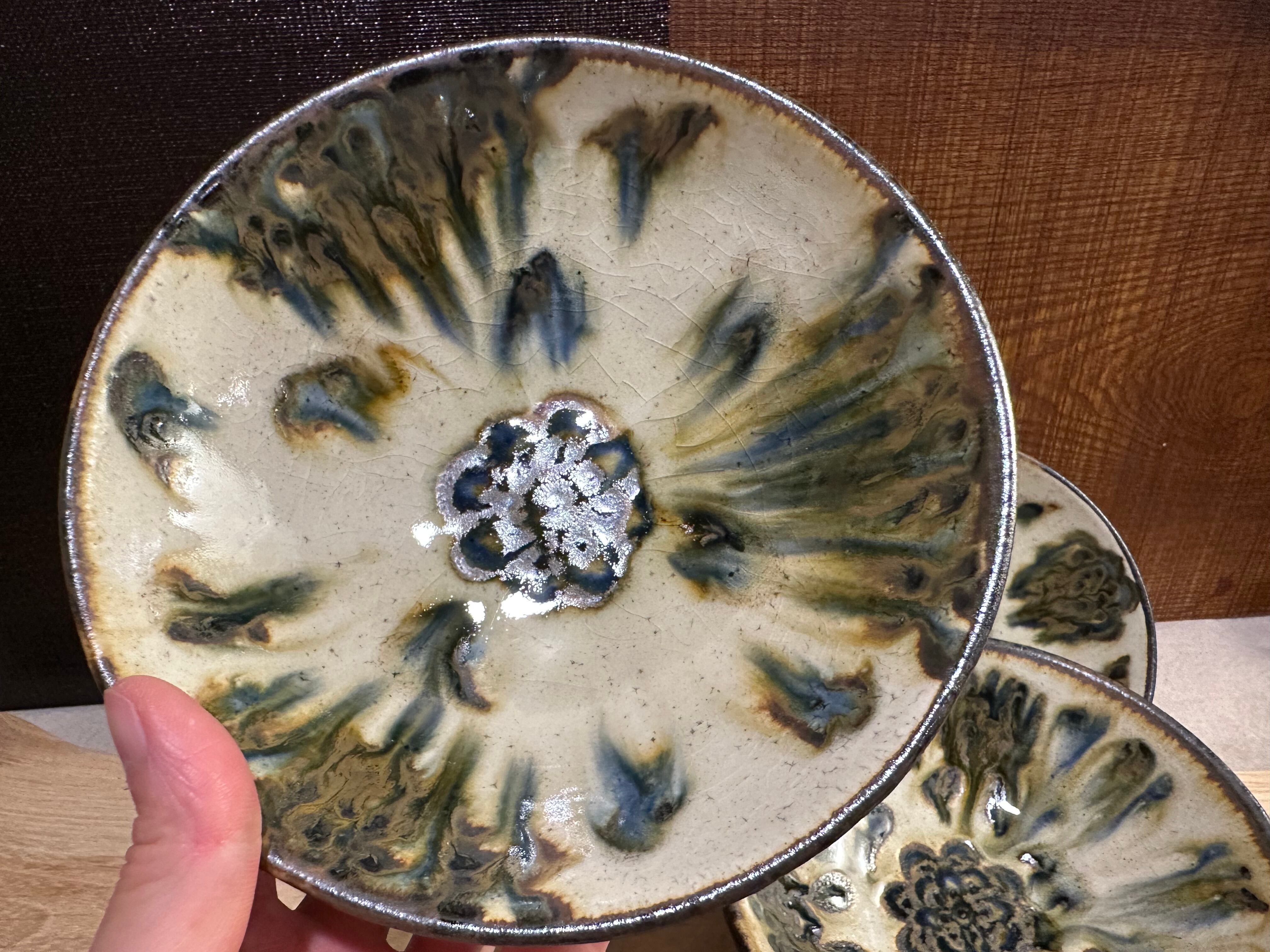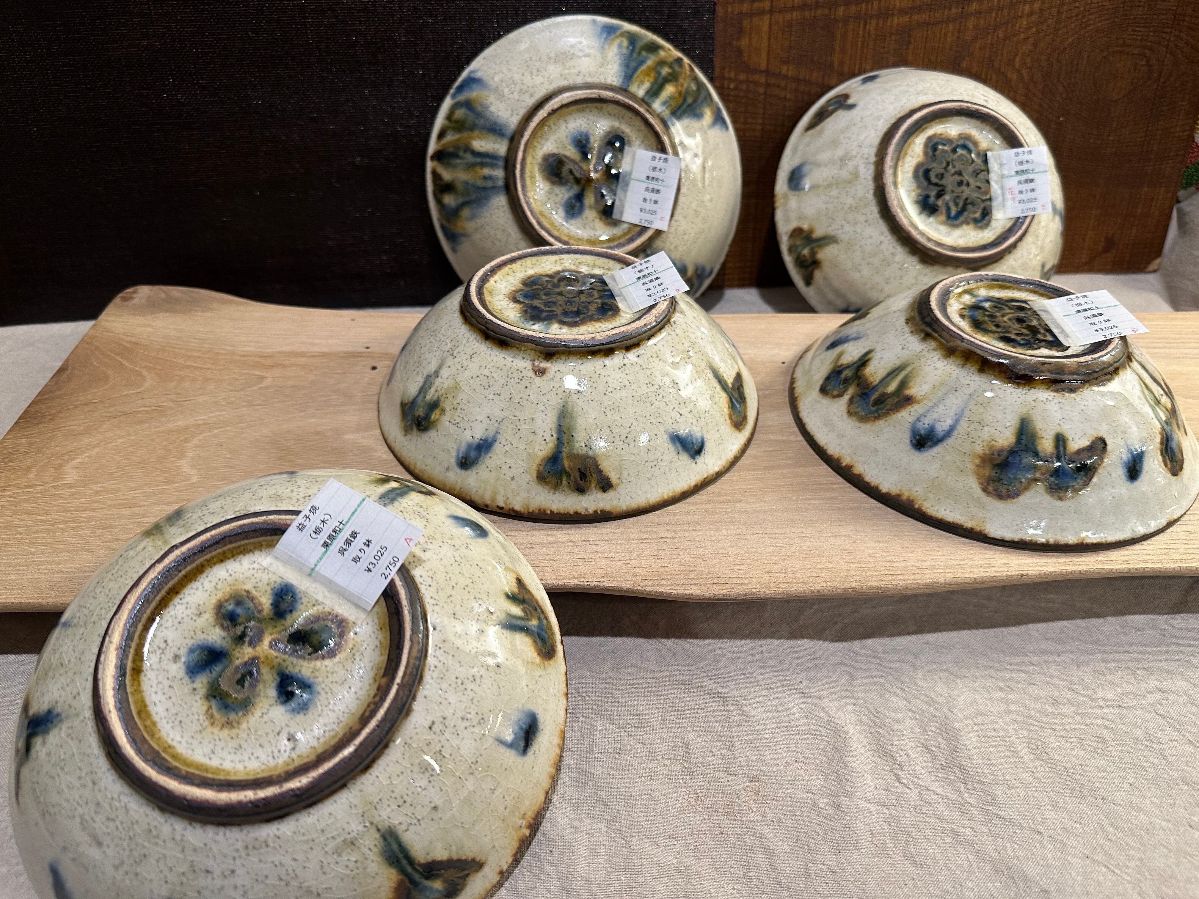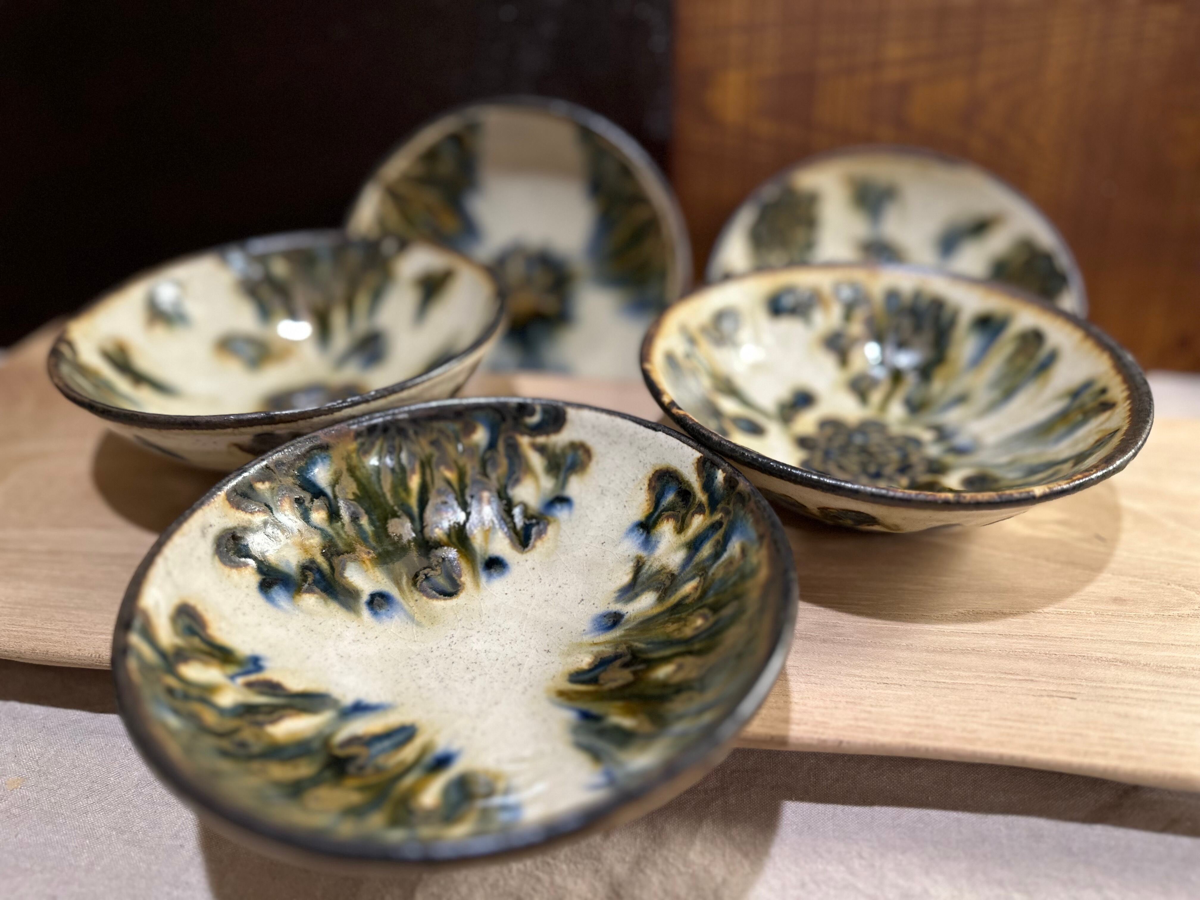 仕上げに灰釉を掛ける事で青色・茶色の模様が滲んだ様子がお気に入りとの事で、試作的に異なる焼き方の作品も混ざっております。