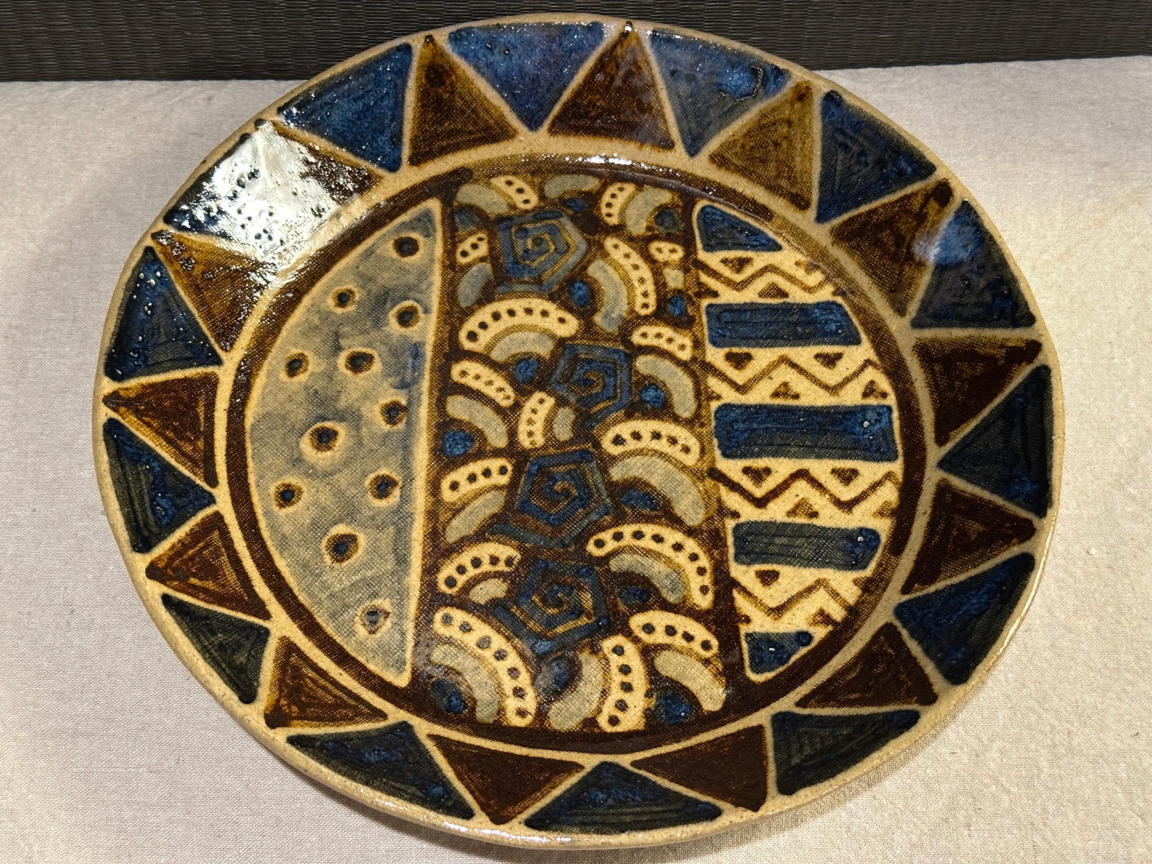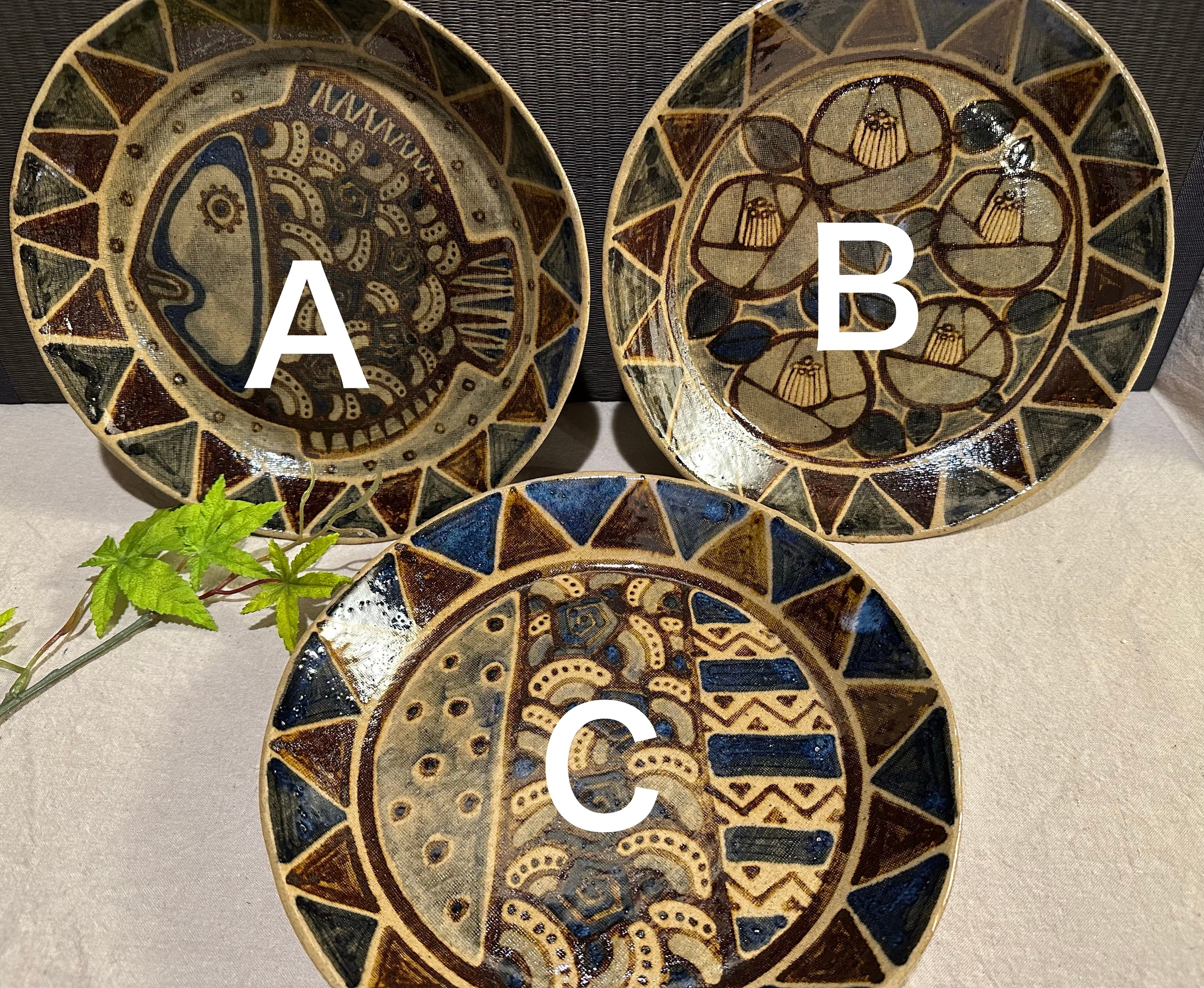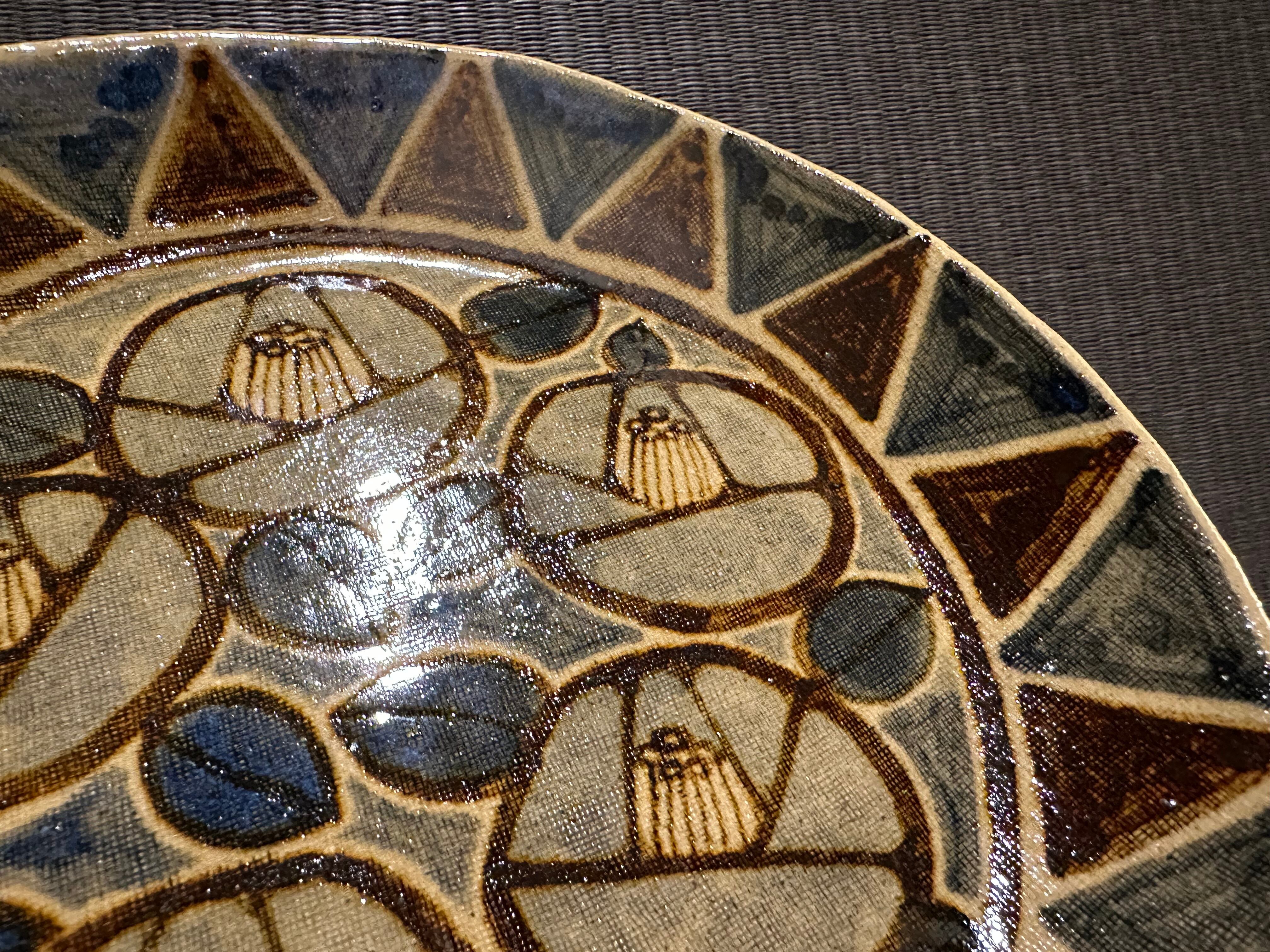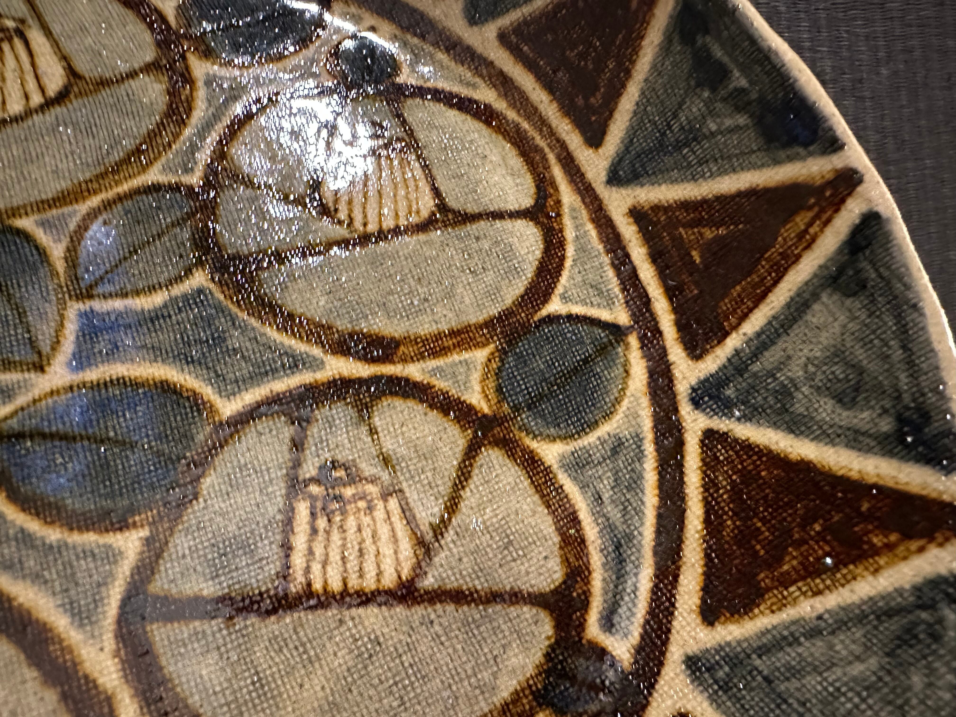 益子焼の伝統色(茶・糠青・白・飴・柿・黒)を基調としたベース地に、チョコペンの様なスポイトの様な容器に粘度を調整した色釉薬を入れてぷっくりとした模様を描いていきます。