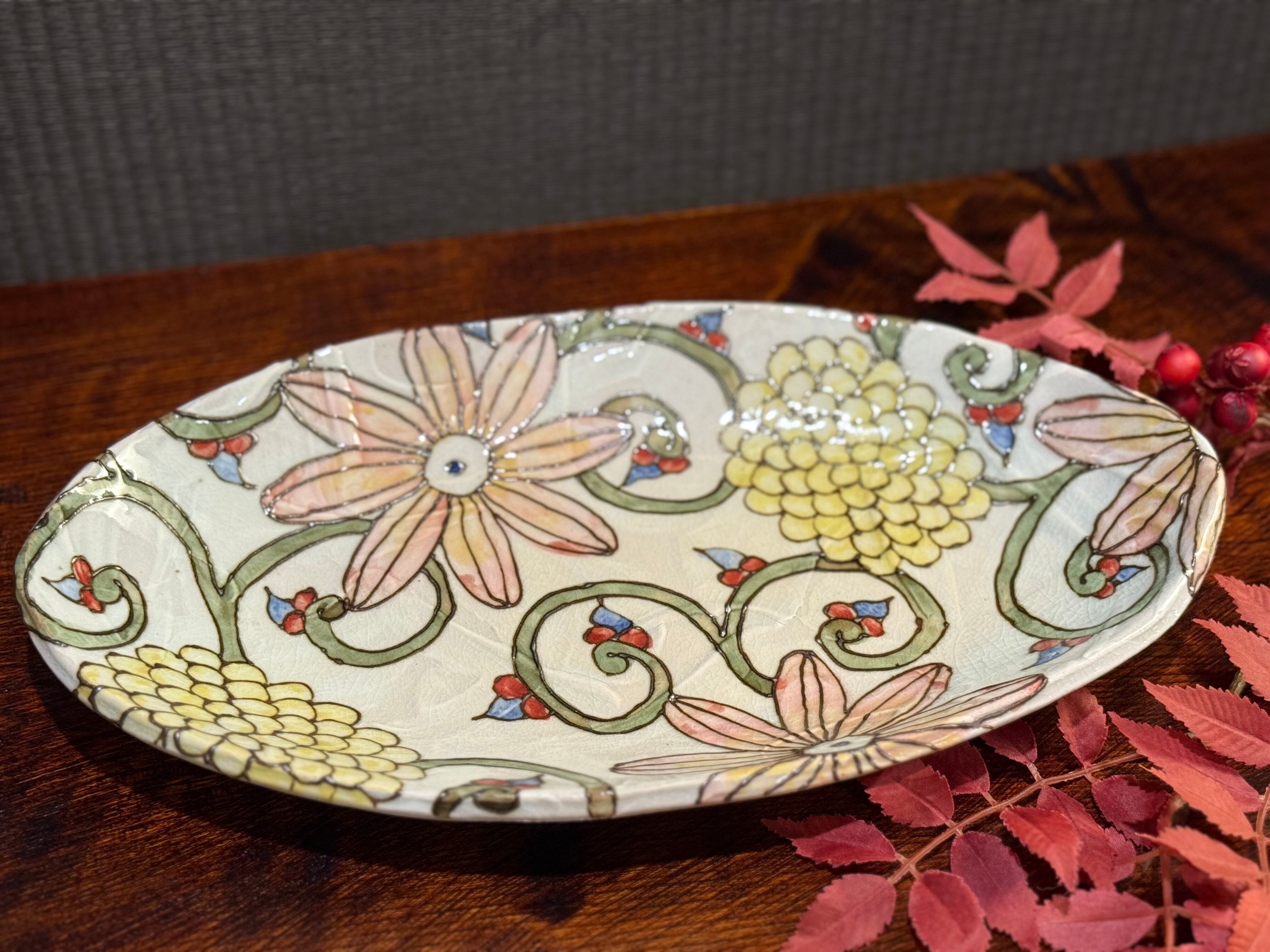 華やかですが温かみにあふれた風合いが魅力的な食器が並んでいます。