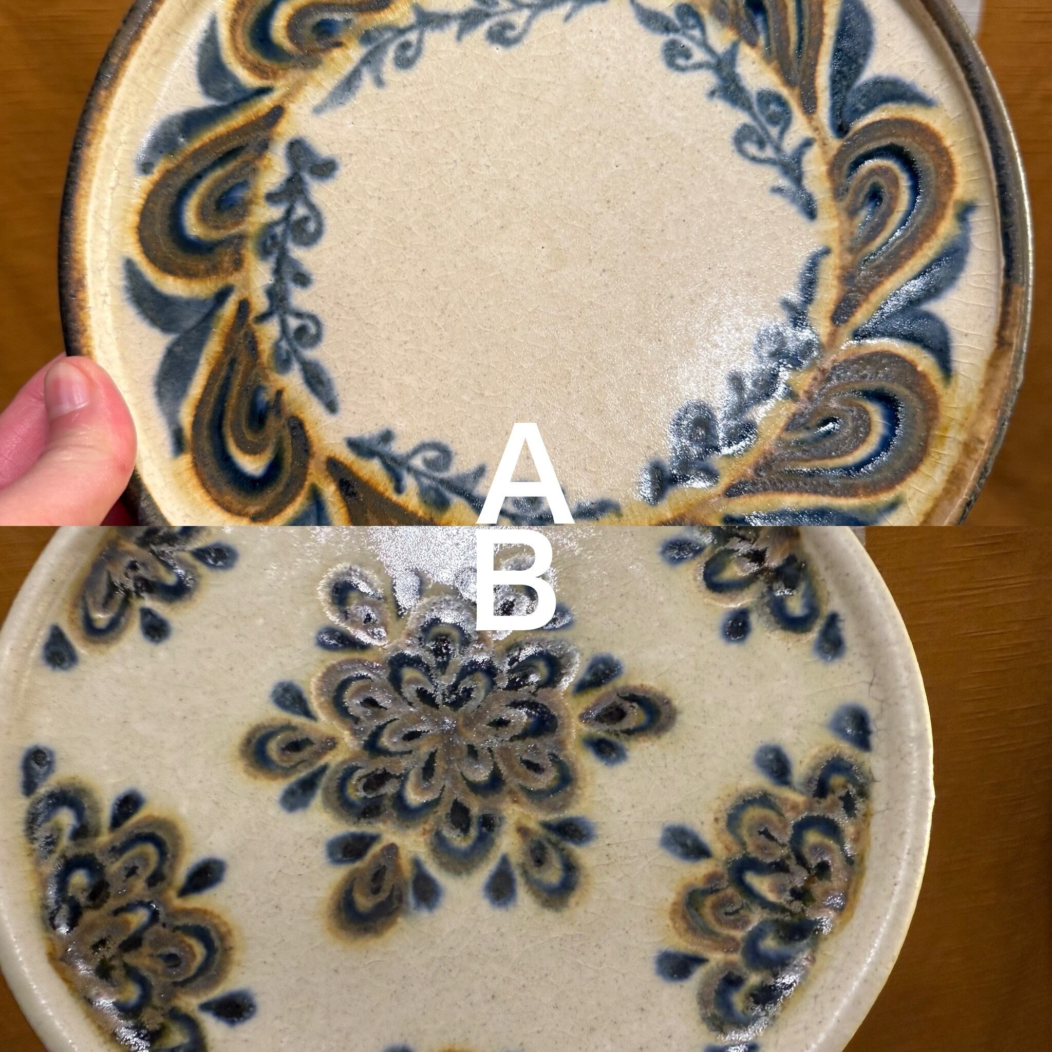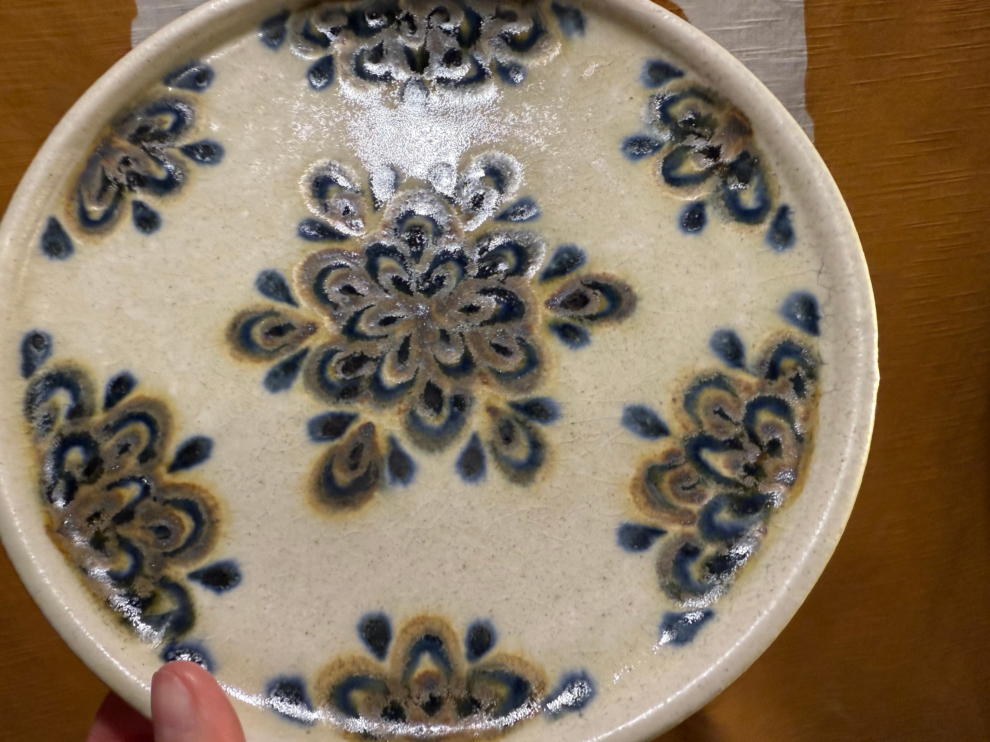 仕上げに灰釉を掛ける事で青色・茶色の模様が滲んだ様子がお気に入りとの事で、試作的に異なる焼き方の作品も混ざっております。
