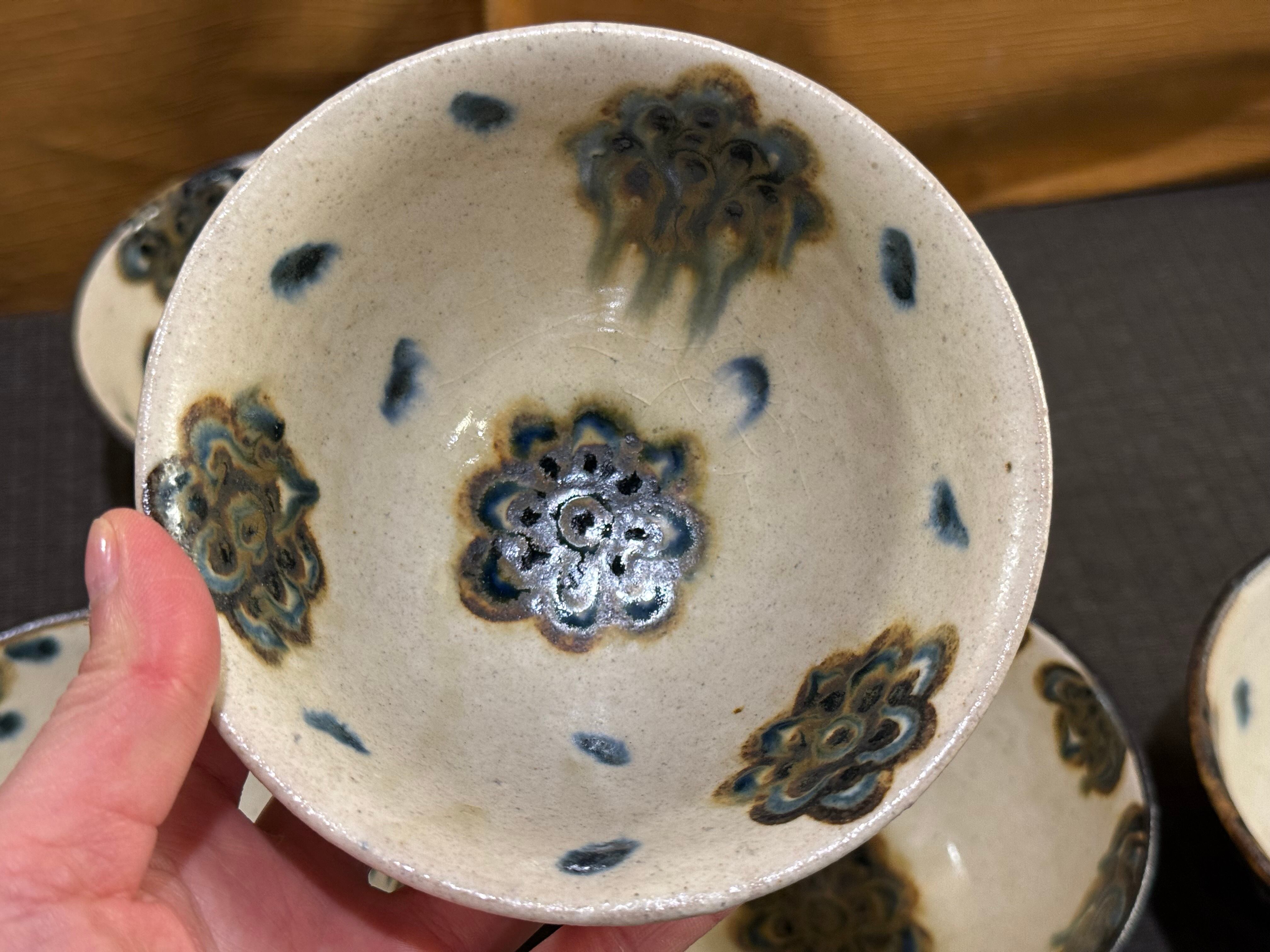仕上げに灰釉を掛ける事で青色・茶色の模様が滲んだ様子がお気に入りとの事で、試作的に異なる焼き方の作品も混ざっております。