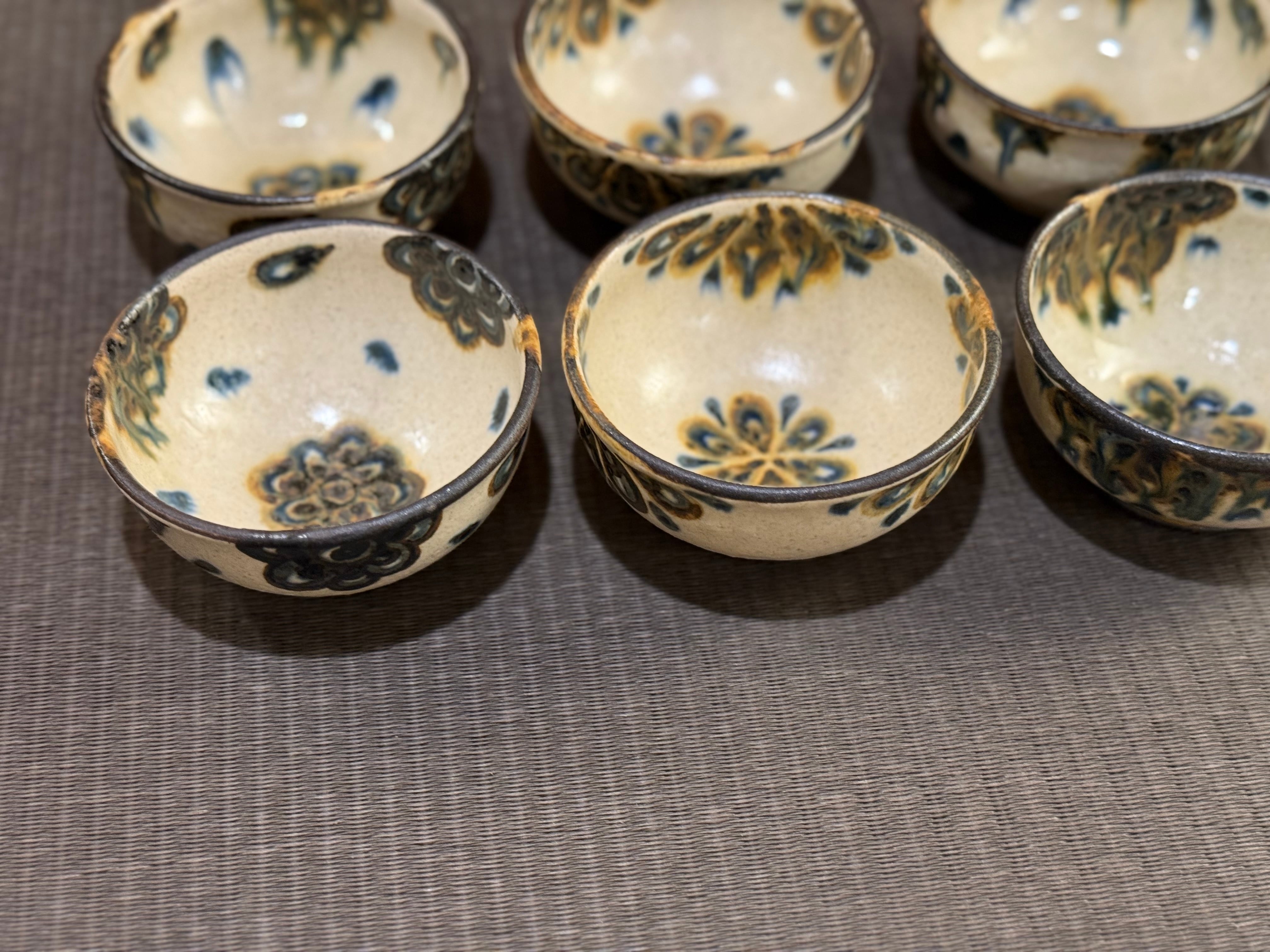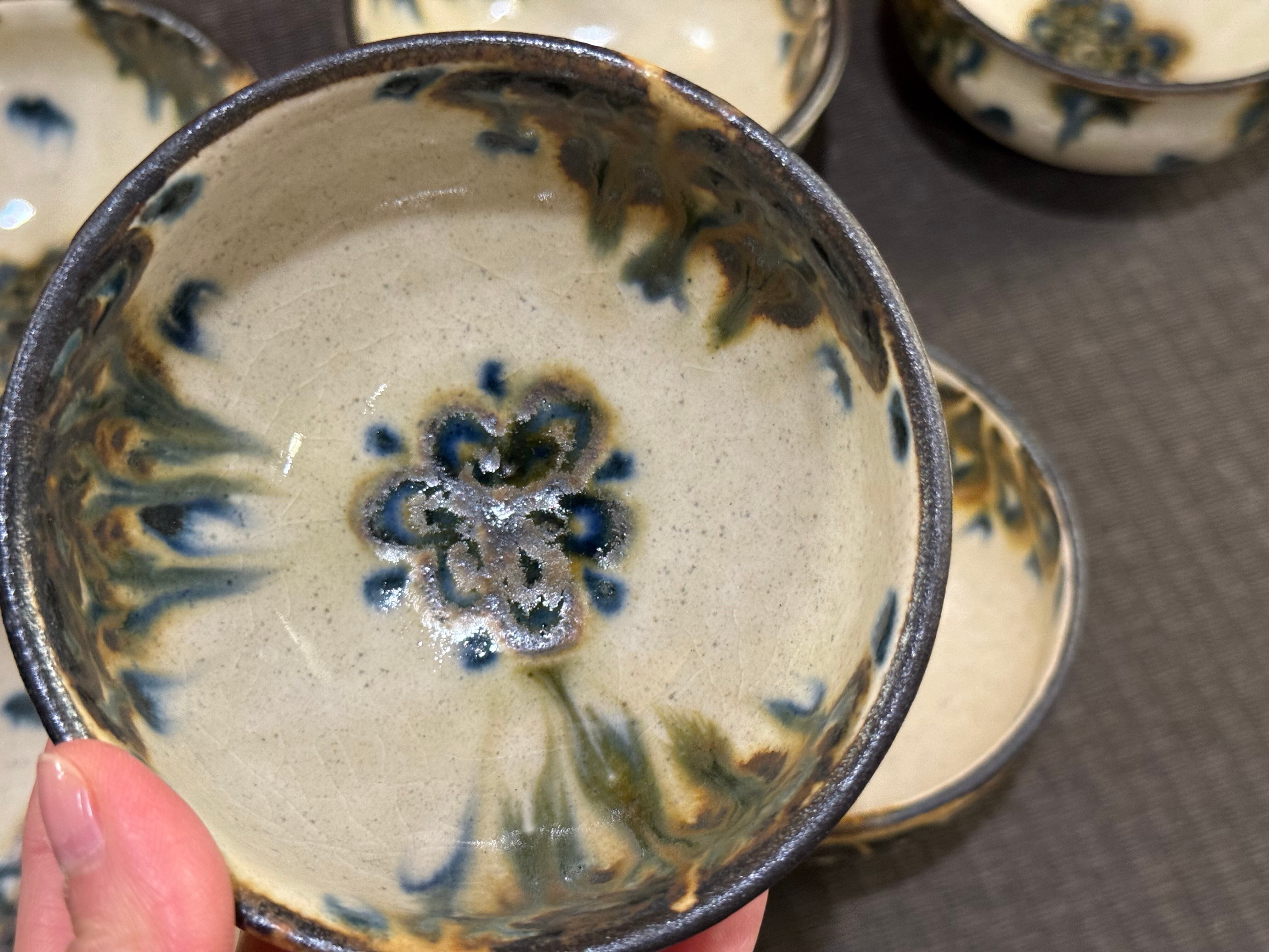 仕上げに灰釉を掛ける事で青色・茶色の模様が滲んだ様子がお気に入りとの事で、試作的に異なる焼き方の作品も混ざっております。