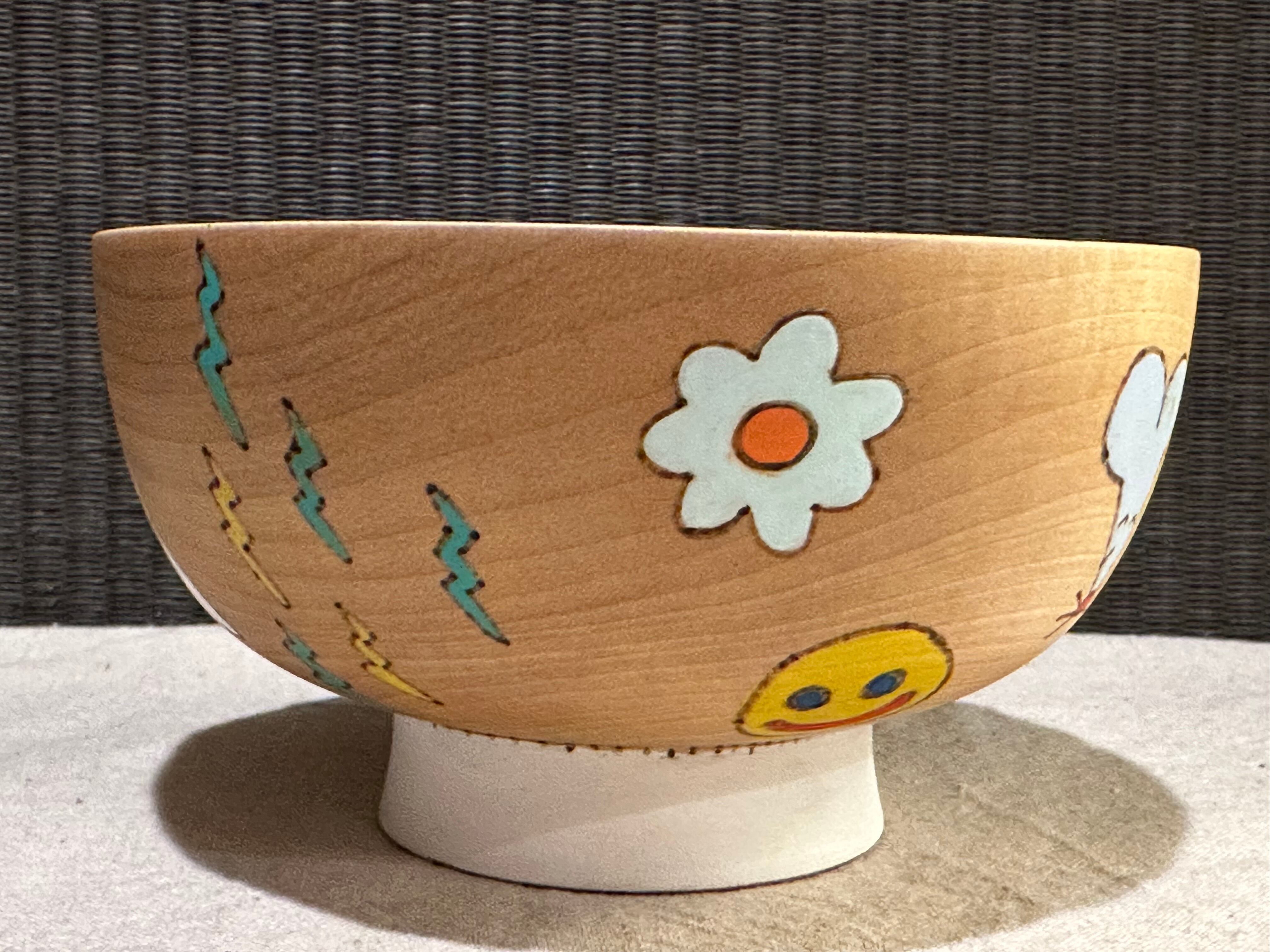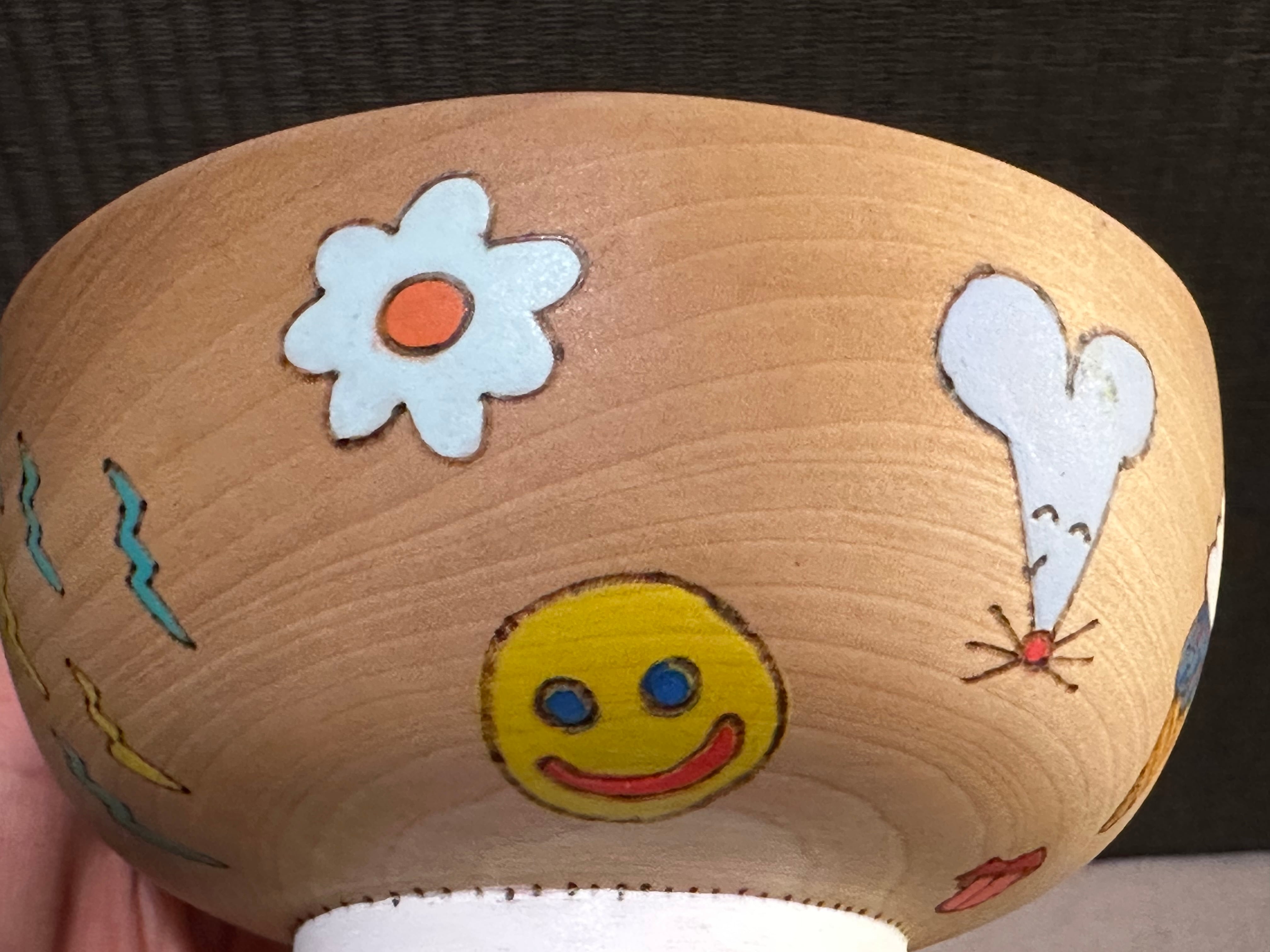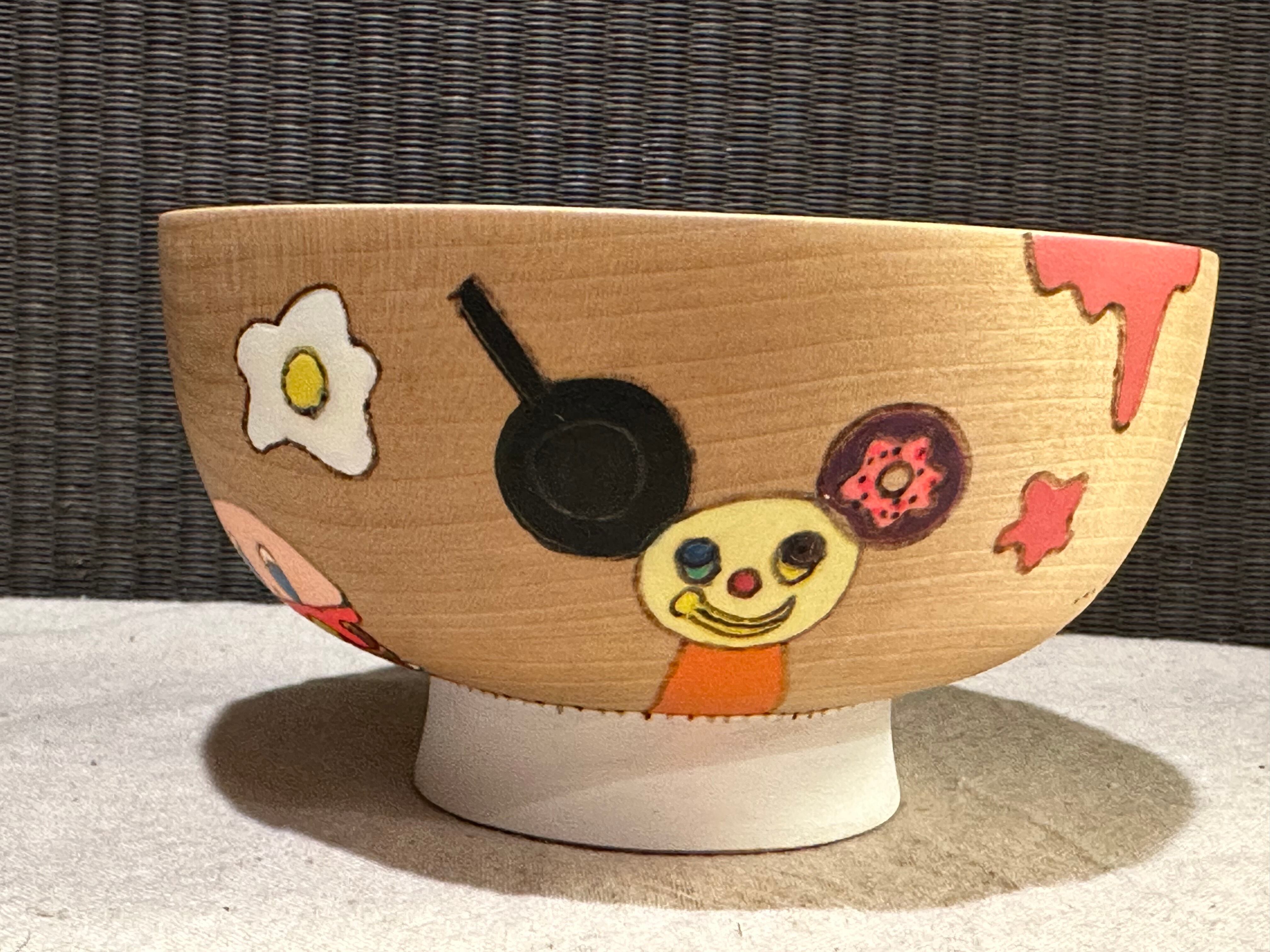 木の第二の人生を、食器としてより長く使ってもらいたいと、バーニング(焼き付け)や染色等を用いて大胆に絵付けを施し、樹脂コーティングで仕上げられています。