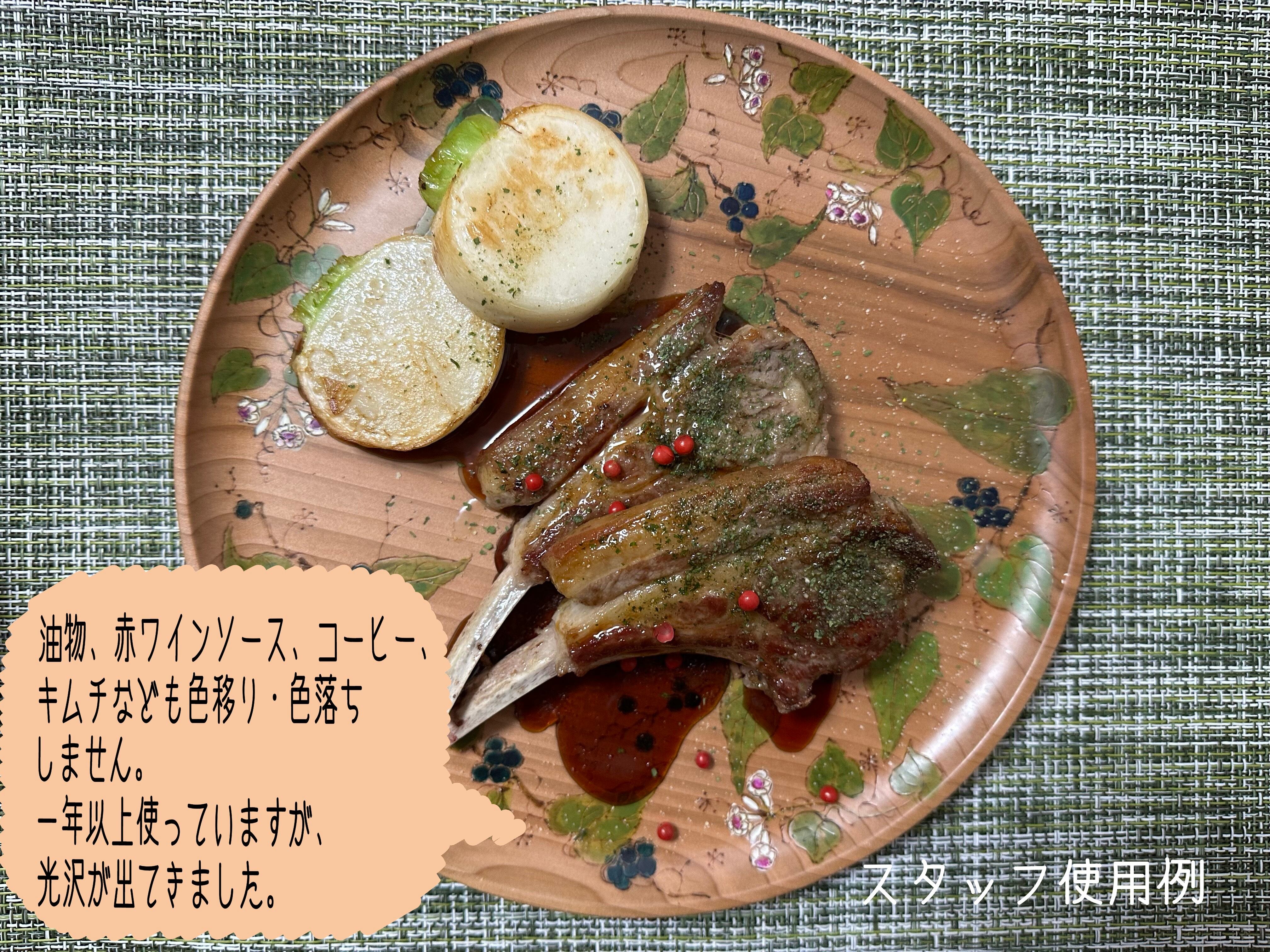 ご注意は浸け置きを避け手洗いで。濃厚なウコンは木地に浸透し着色の可能性がございますのでご留意ください。