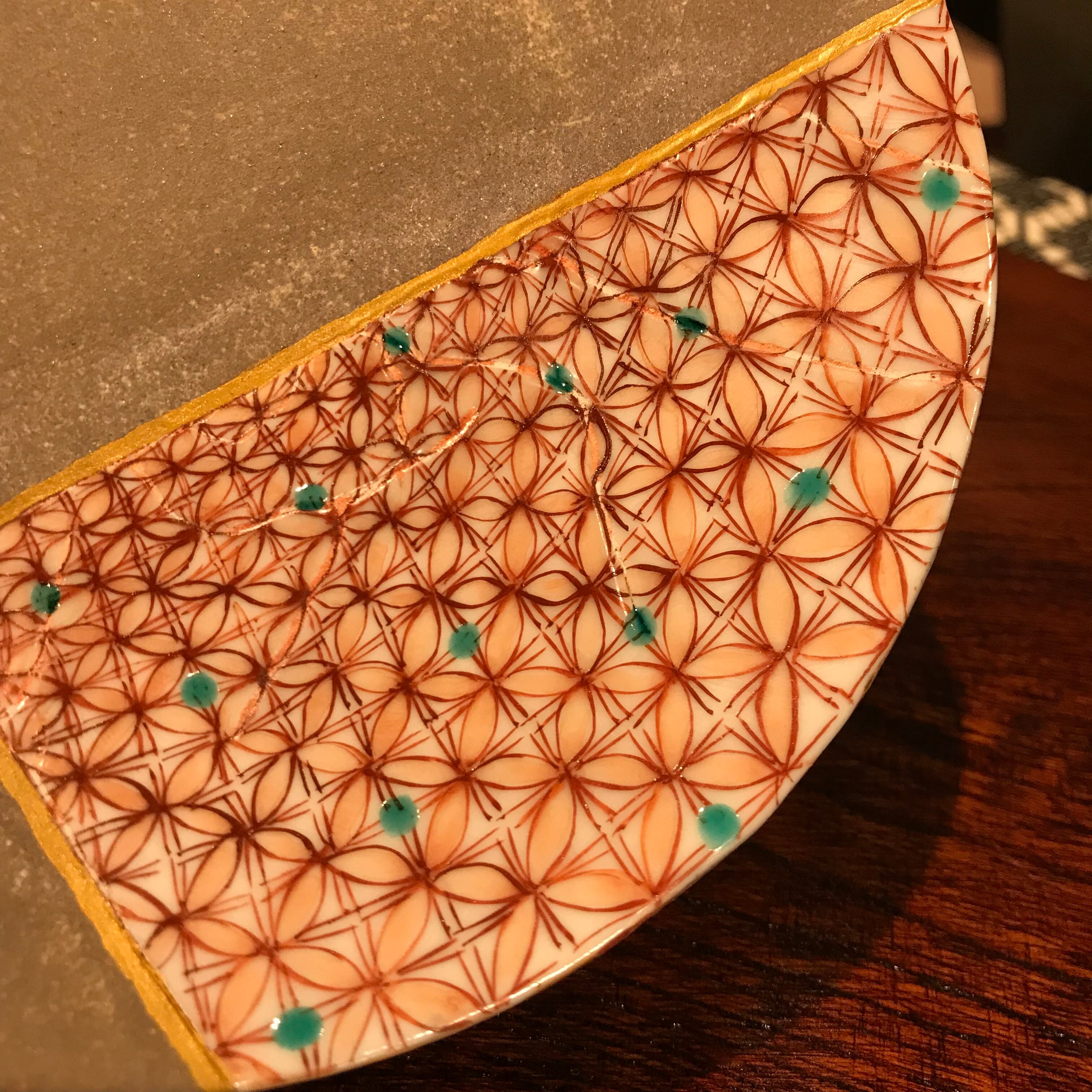 ※土と磁器と境目には金彩を施しておりますが、他部分の焼割れ模様についてはそのままに、マット釉で染み込みを防ぐ様仕上げております。お醤油・油物などもお使いいただけますが、土部分においてはやや色合いが暗く変化してきます。それも風合いとしてお楽しみいただくのも醍醐味としておすすめさせて頂いておりますが、抵抗をお持ちな場合、先にお皿自体を水に浸けてから(土の色が変わるまで)、お使いいただくと、染み込みを軽減させることが出来ます。