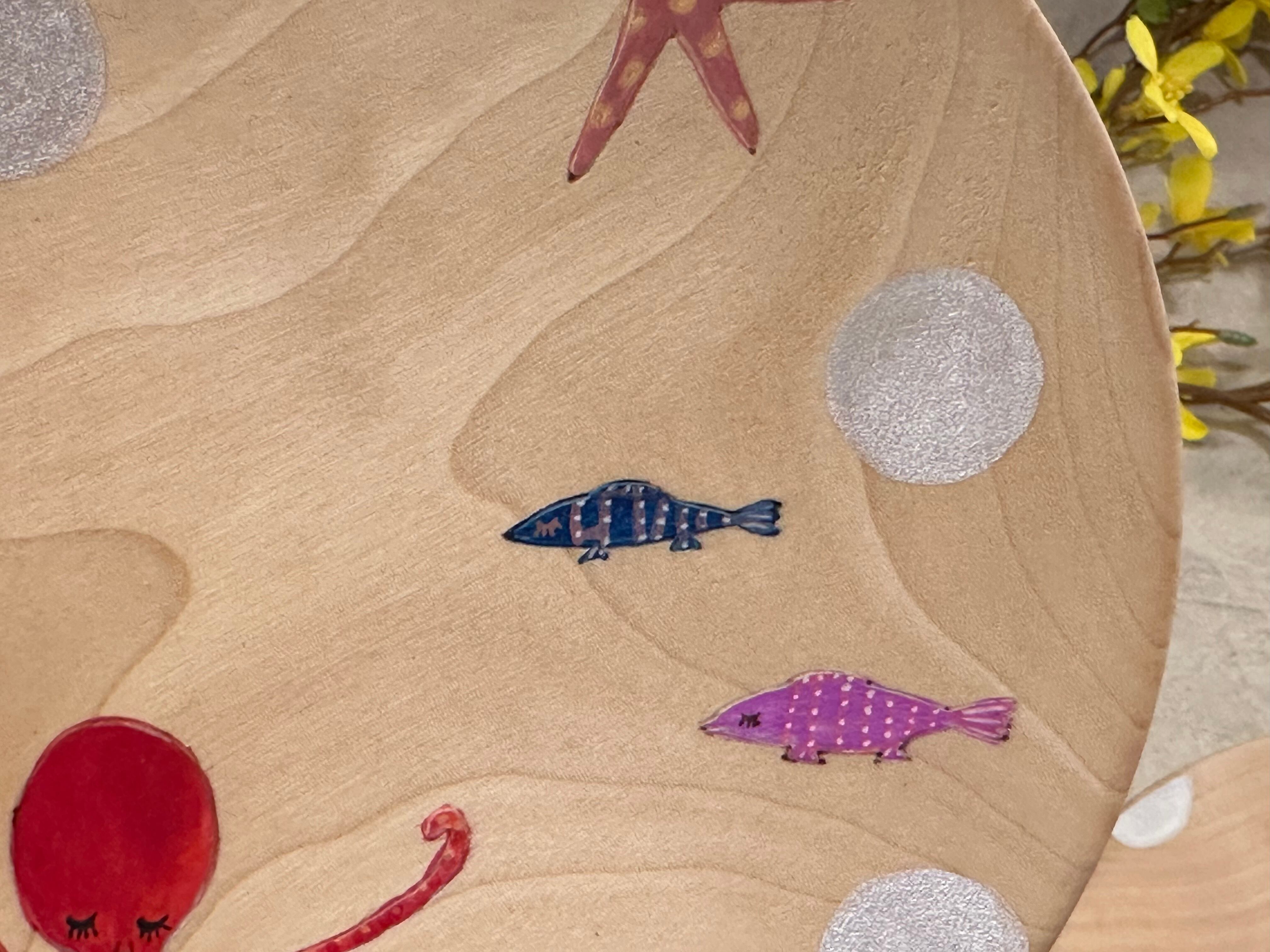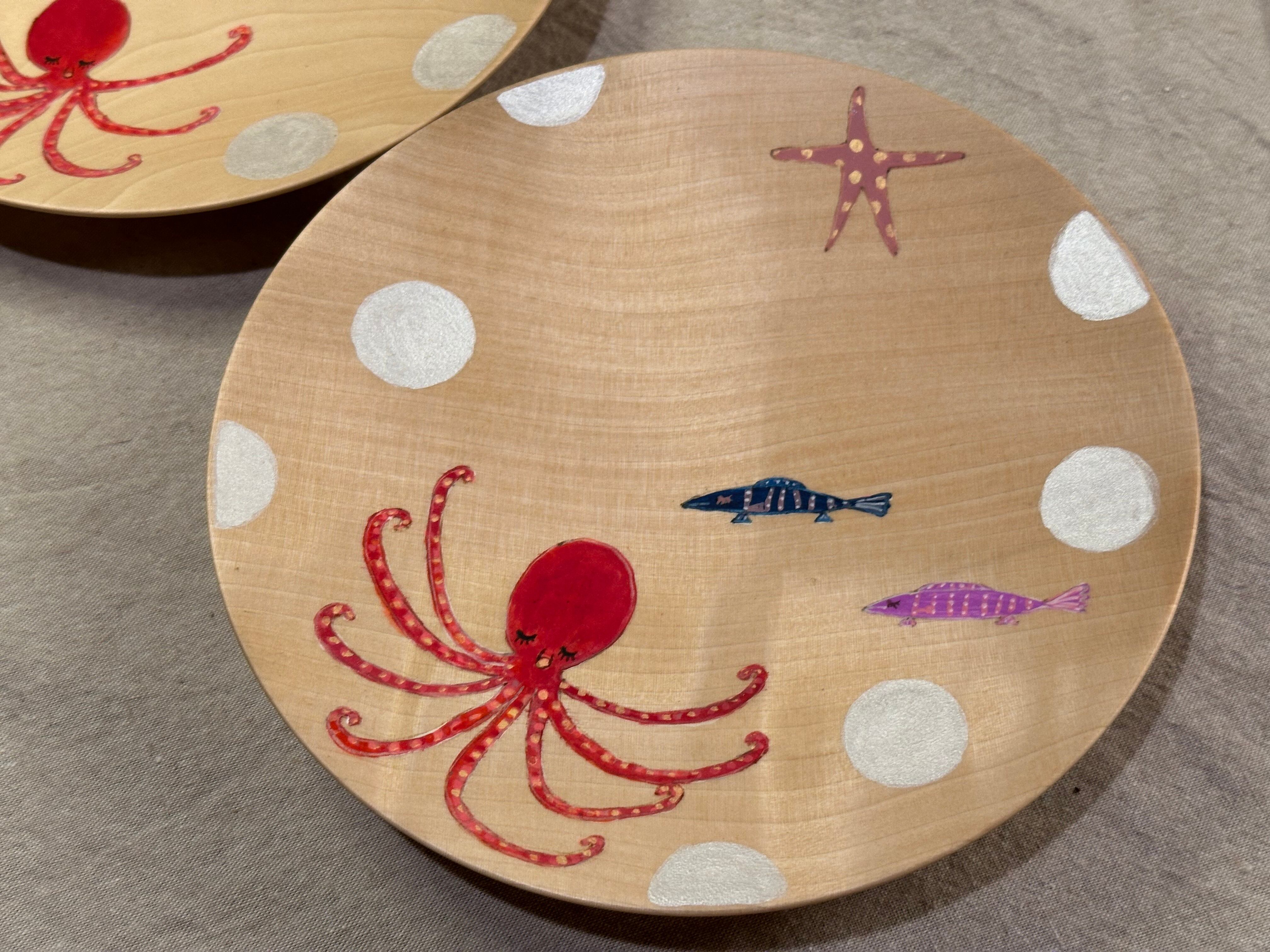 木の第二の人生を、食器としてより長く使ってもらいたいと、バーニング(焼き付け)や染色等を用いて大胆に絵付けを施し、樹脂コーティングで仕上げられています。