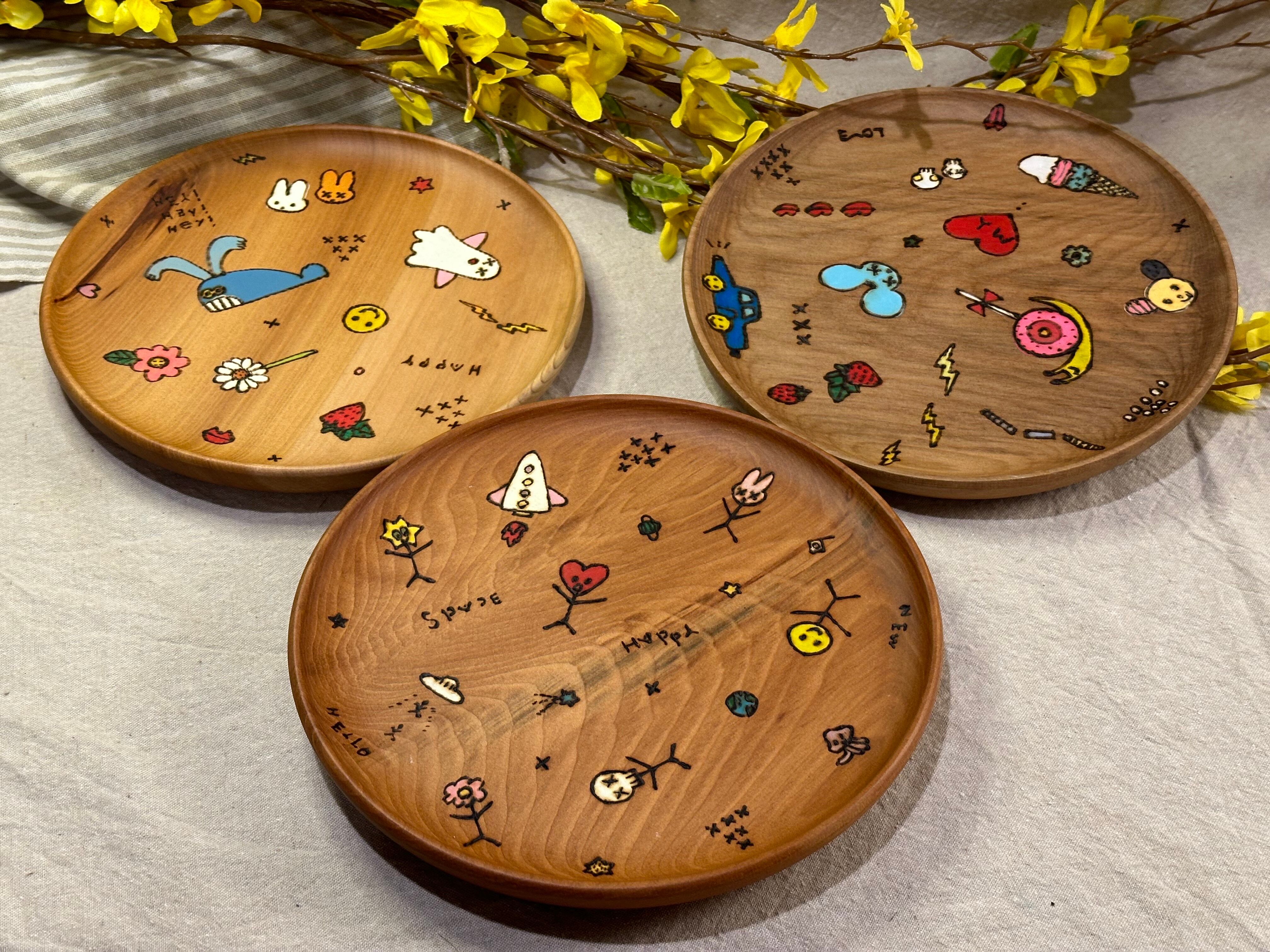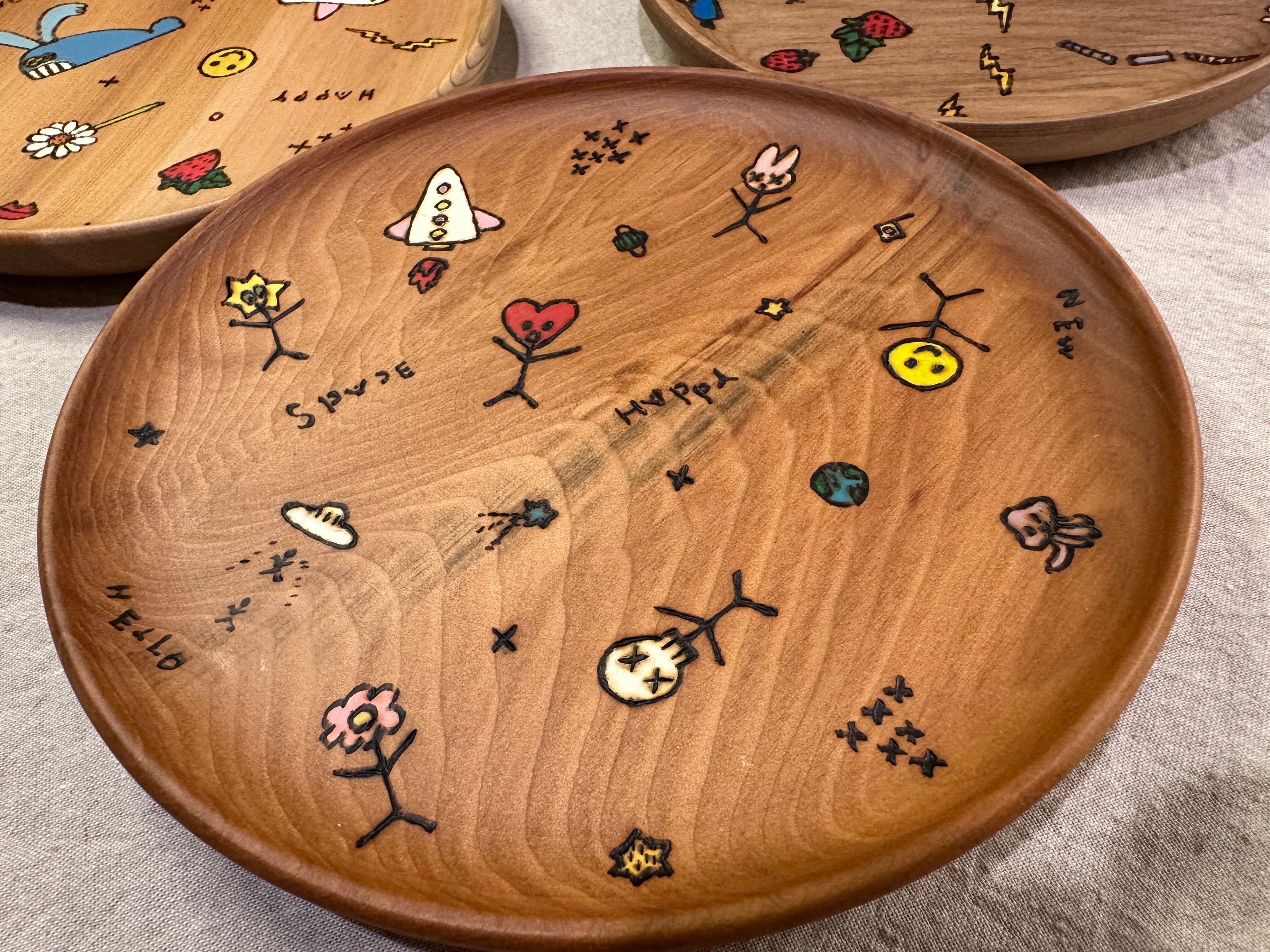 木の第二の人生を、食器としてより長く使ってもらいたいと、バーニング(焼き付け)や染色等を用いて大胆に絵付けを施し、樹脂コーティングで仕上げられています。