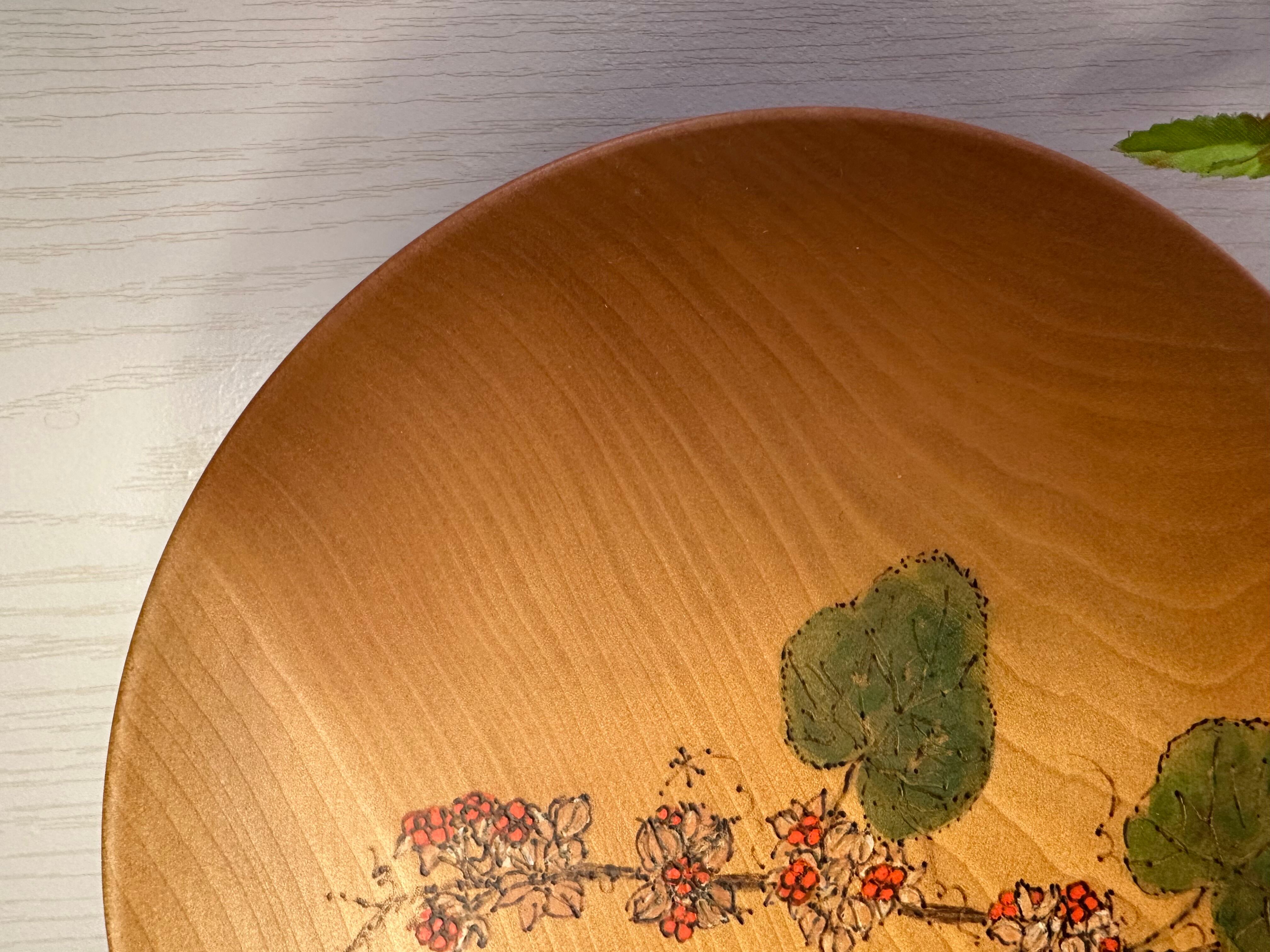 絵付け:木の第二の人生を、食器としてより長く使ってもらいたいと、バーニング(焼き付け)や染色等を用いて大胆に絵付けを施し、樹脂コーティングで仕上げられています。